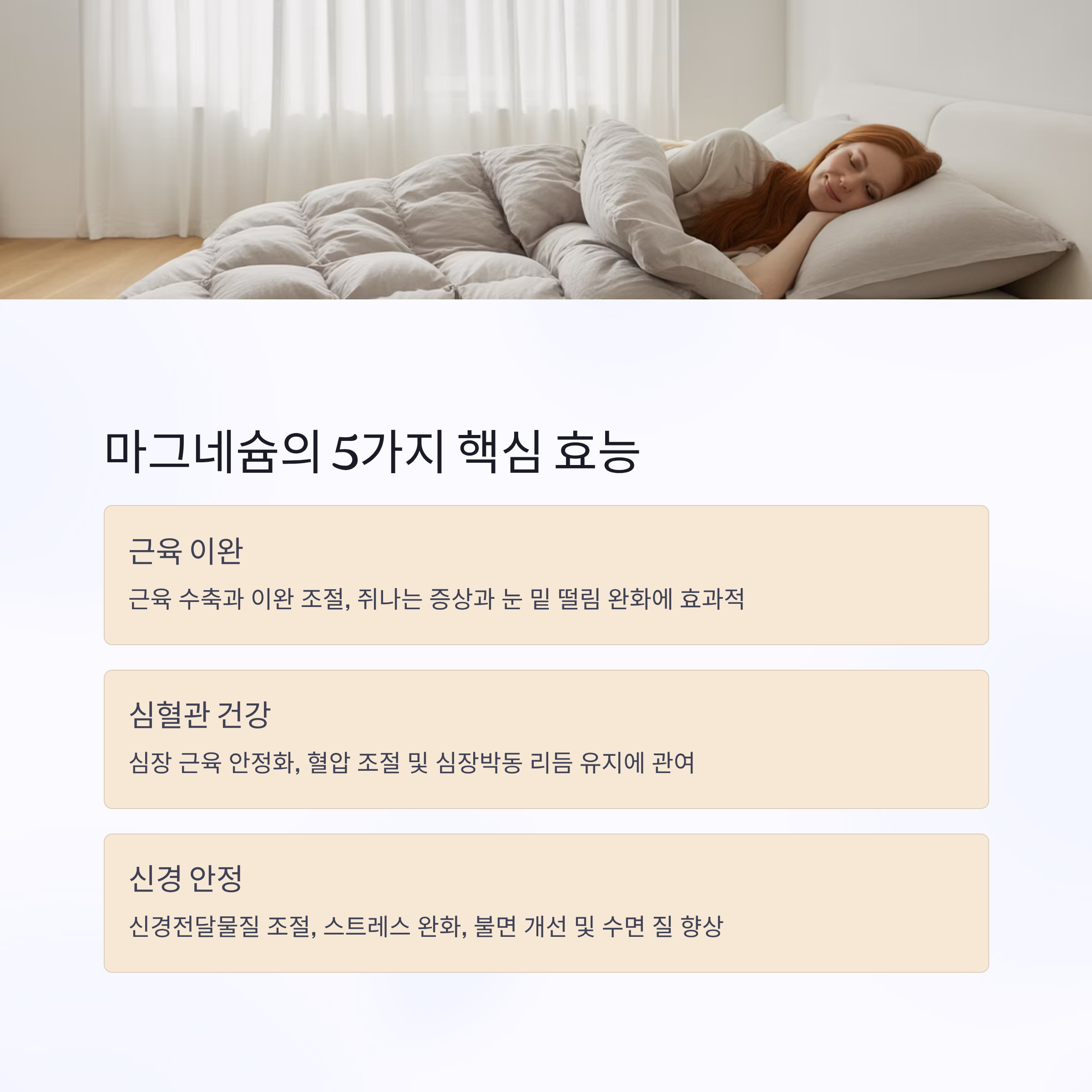 | 효능 | 근육·심장·신경 안정, 혈당·수면 개선, 뼈 건강 유지 |