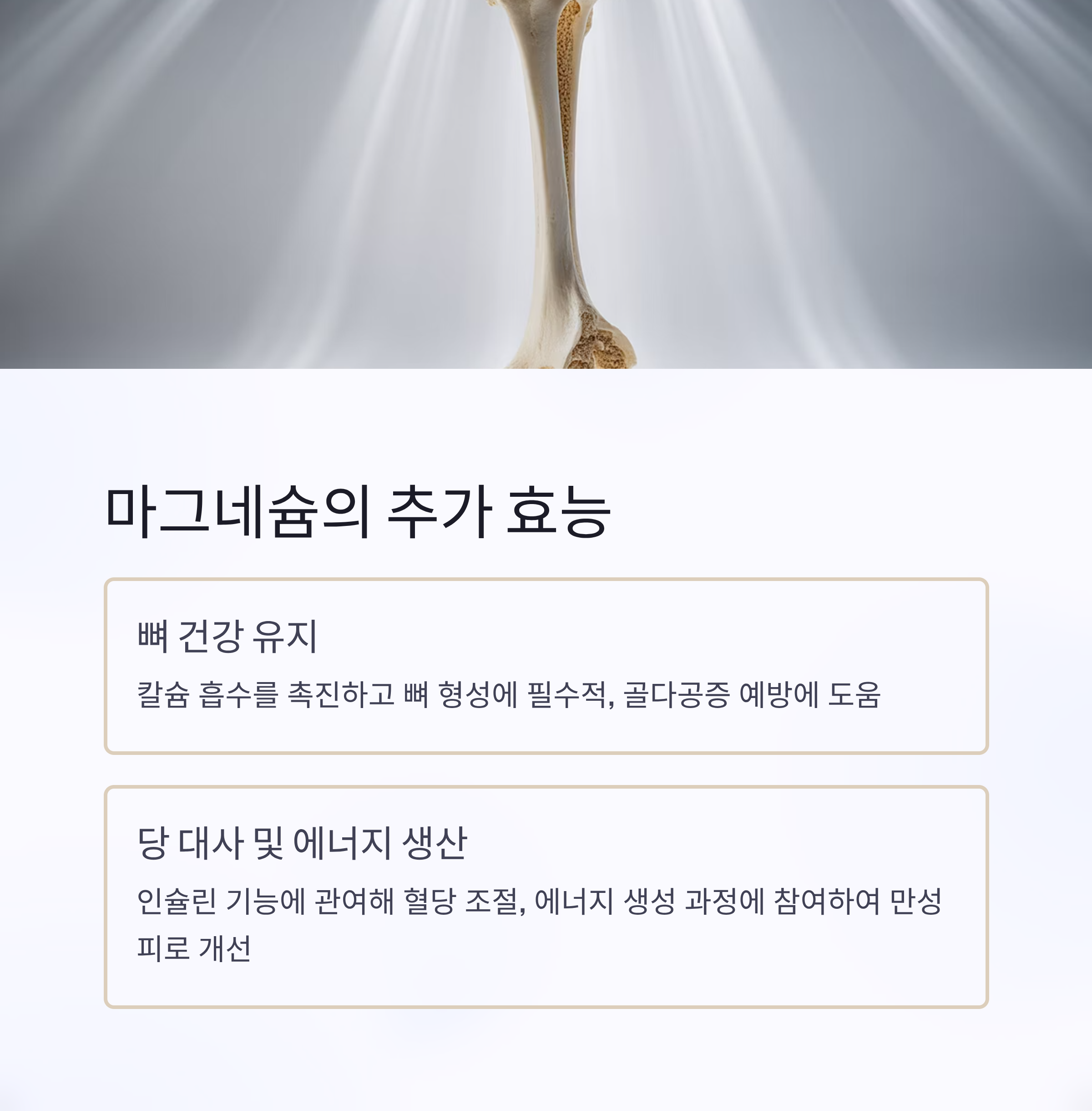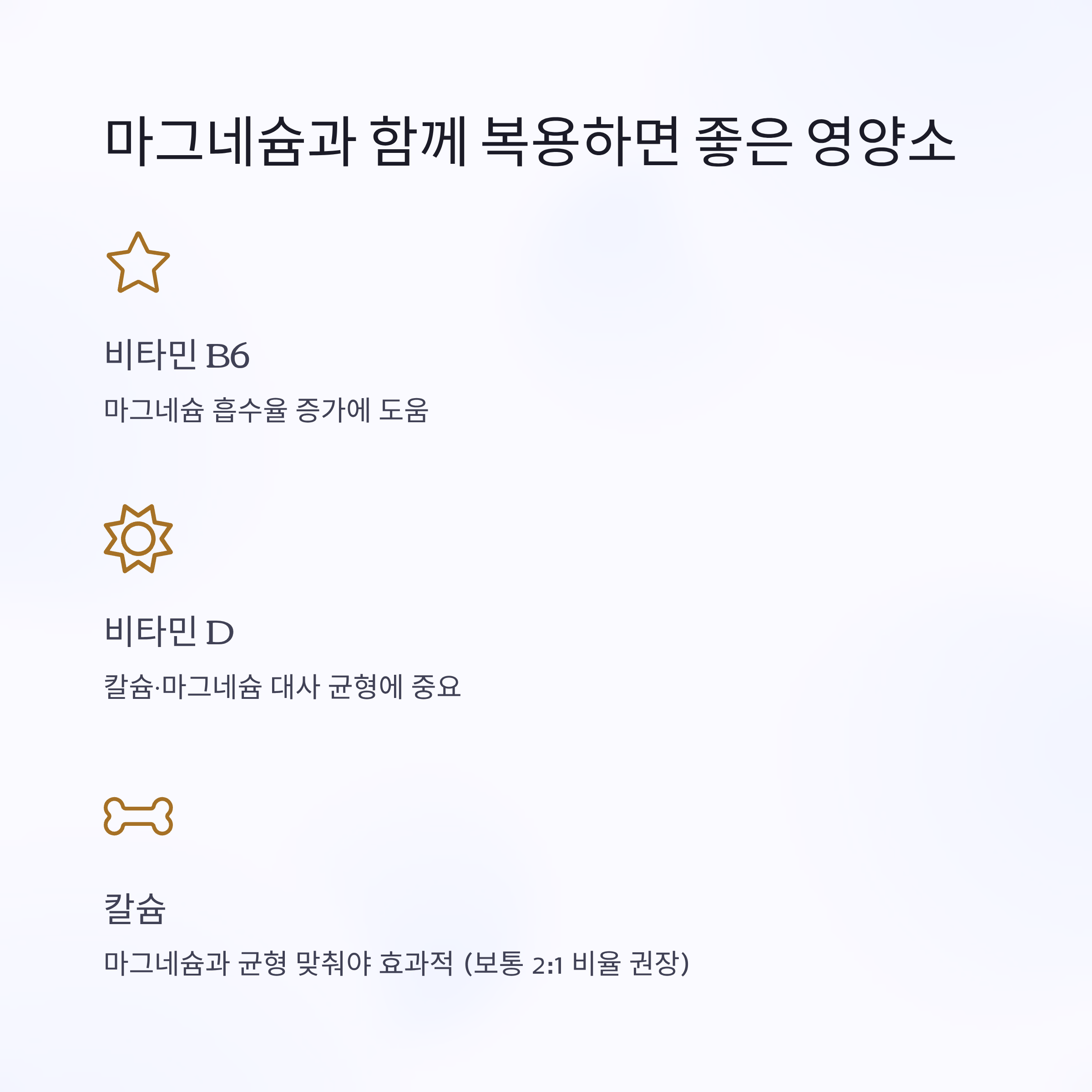 - 칼슘: 마그네슘과 균형 맞춰야 효과적 (보통 2:1 비율 권장)