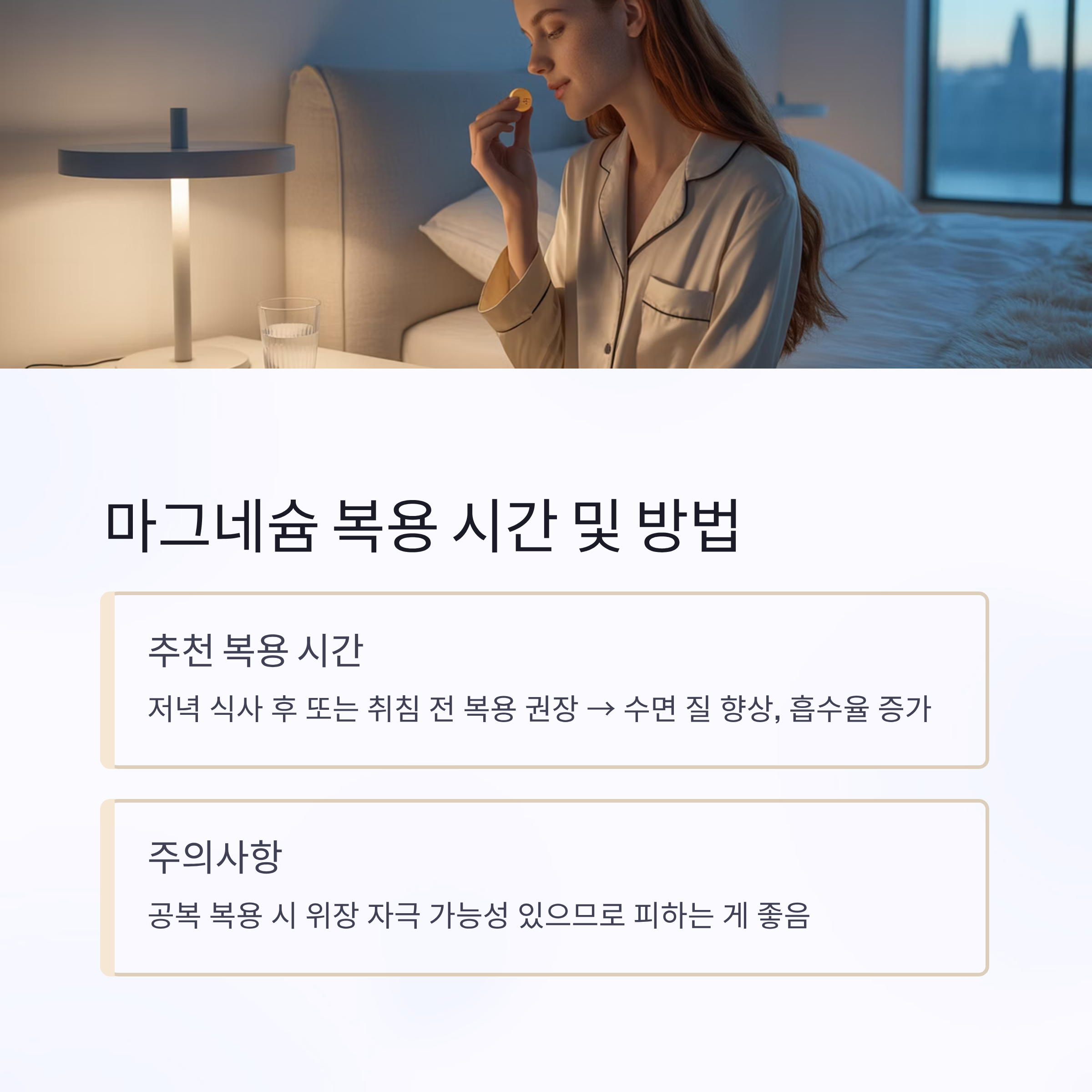 → 수면 질 향상, 흡수율 증가 - 공복 복용 시 위장 자극 가능성 있으므로 피하는 게 좋음