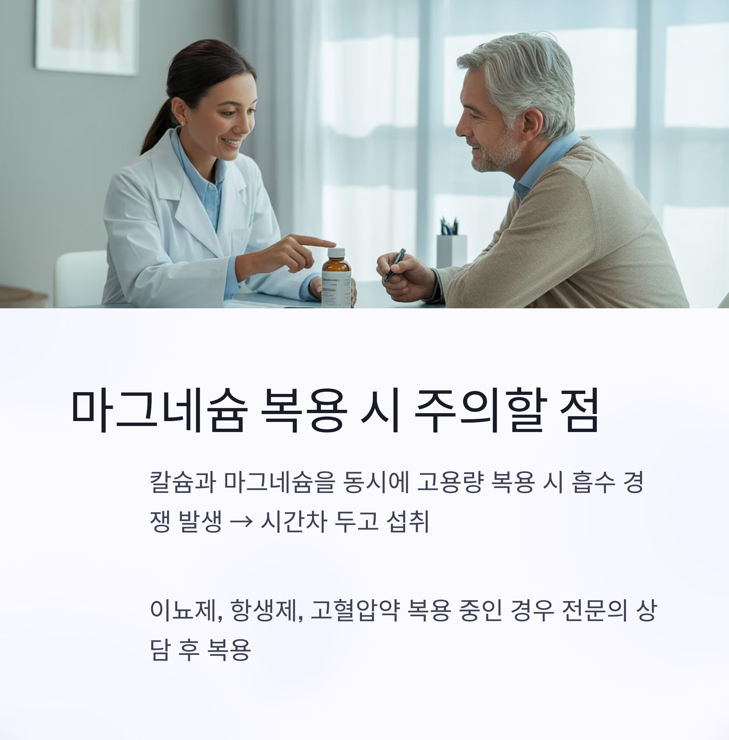 - 칼슘과 마그네슘을 동시에 고용량 복용 시 흡수 경쟁 발생 → 시간차 두고 섭취
