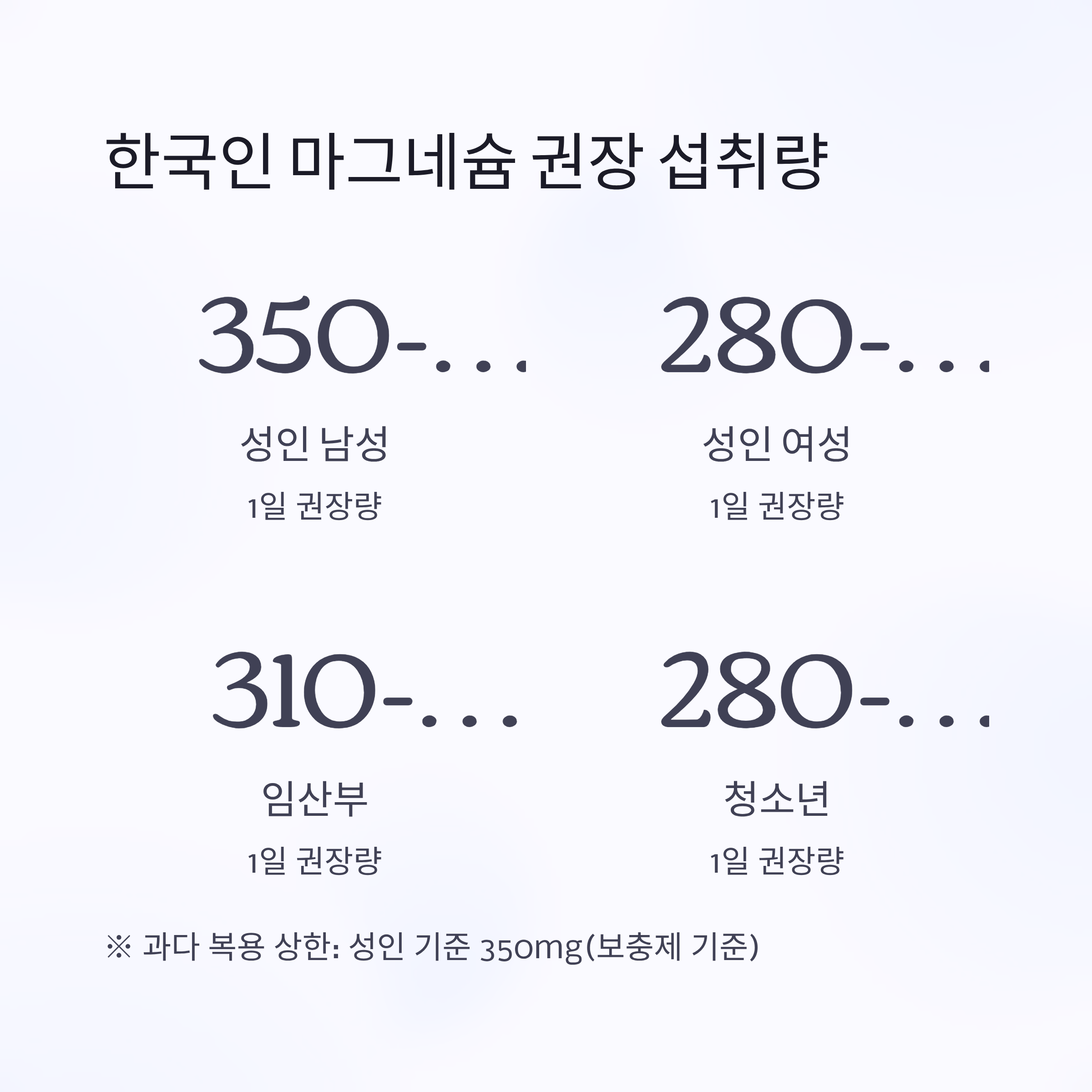 ※ 과다 복용 상한: 성인 기준 350mg(보충제 기준)