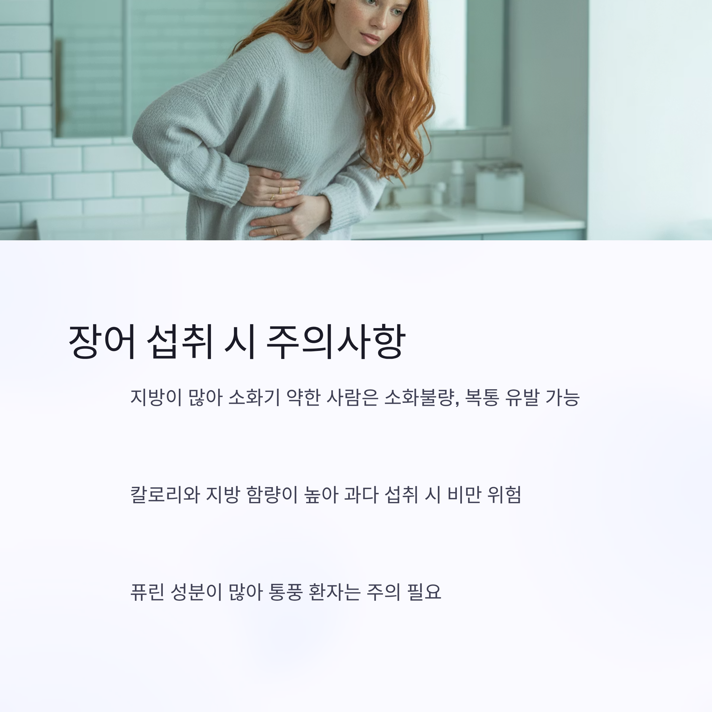 - 통풍 환자 주의: 장어의 퓨린 성분이 요산 생성 촉진, 통풍 환자에게는 증상 악화 우려.