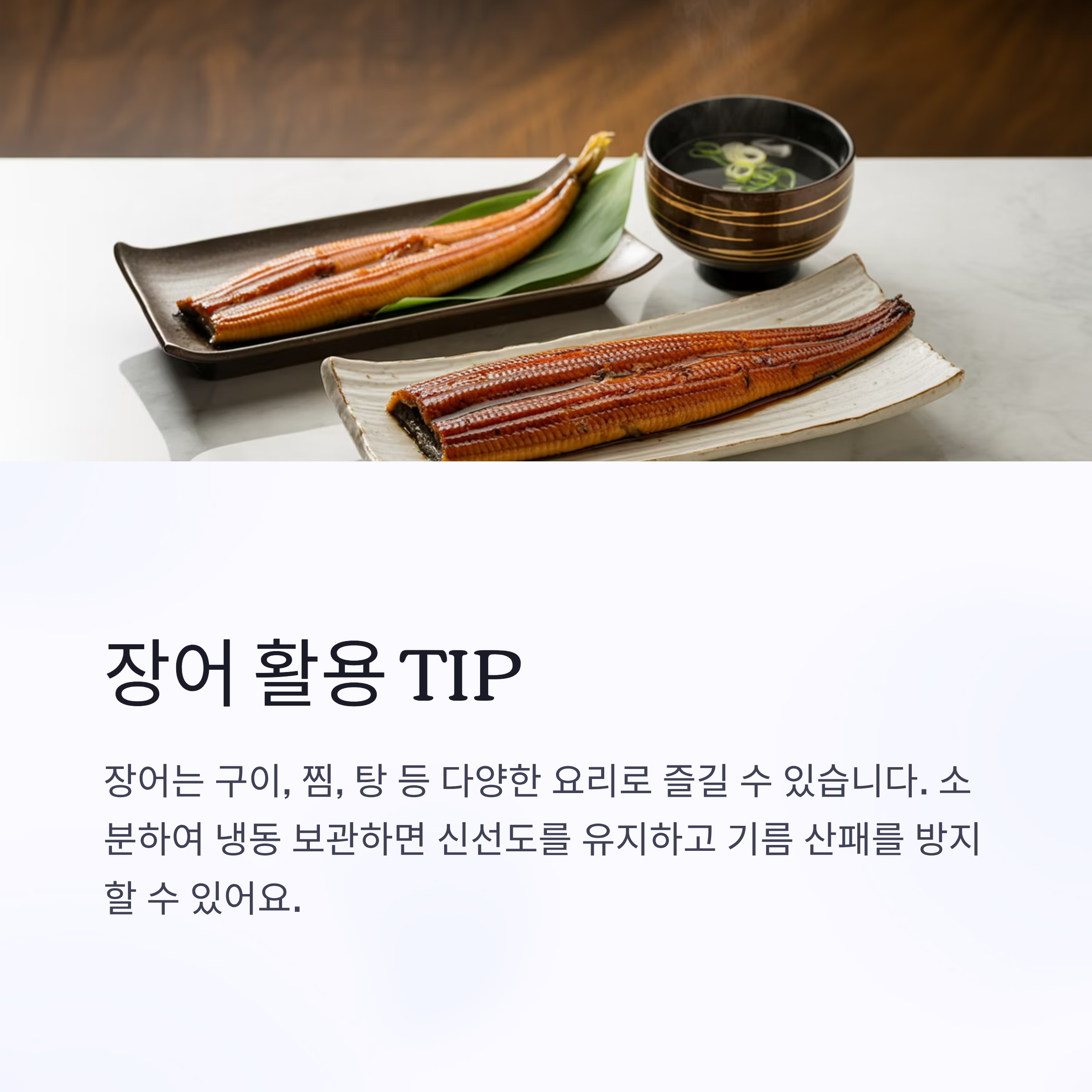 - 장어는 구이·찜·탕 등 다양한 요리에 활용 가능하며, 부추·생강·양파 등과 곁들이면 맛과 건강 효능이 배가됩니다.