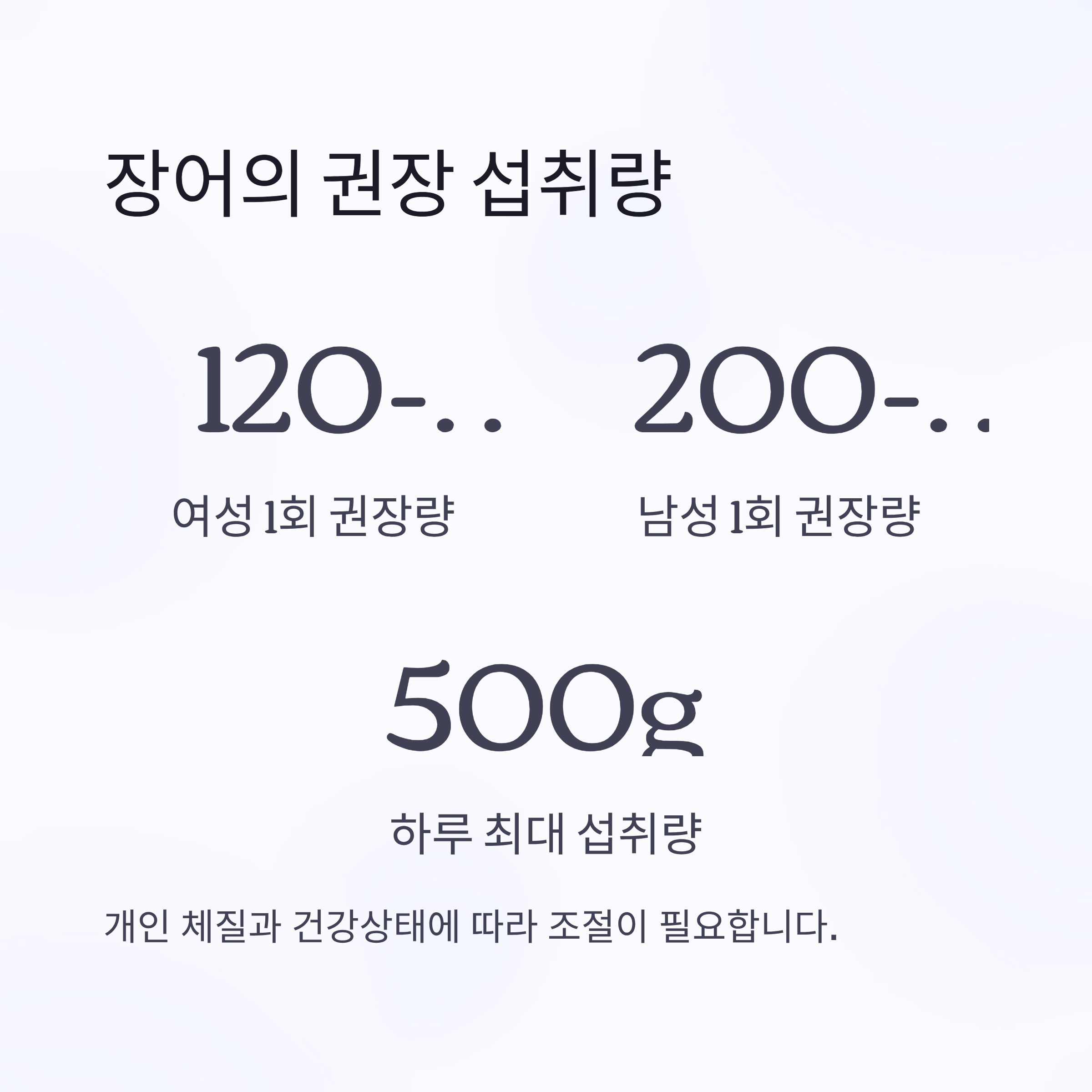 - 개인 및 체질, 건강상태에 따라 다르므로, 소화 장애·고지혈증 등 질환 있으면 더 적은 양으로 조절
