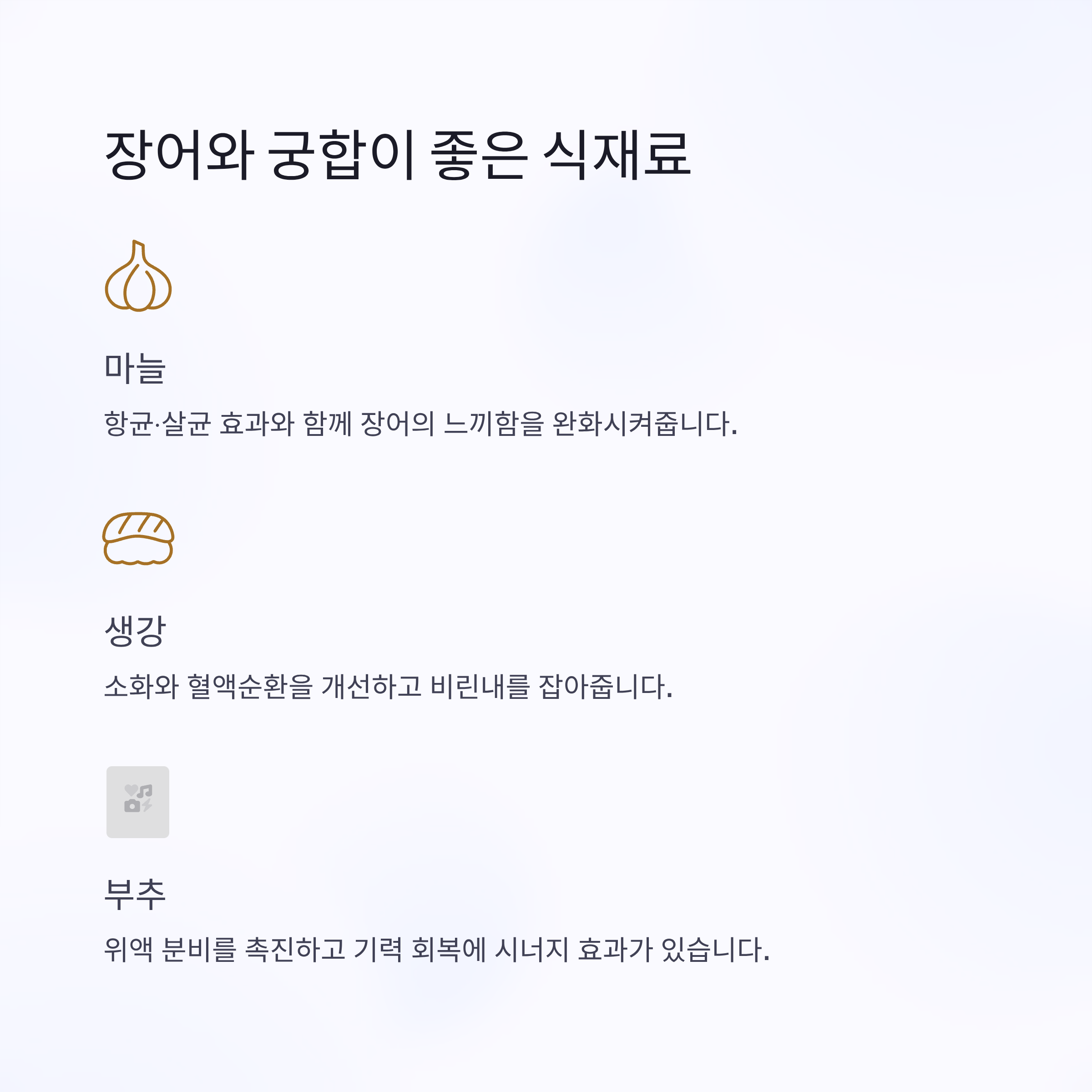 - 부추: 알리신 성분이 위액 분비 촉진, 소화 기능 강화. 따뜻한 성질로 기력 회복에 시너지.