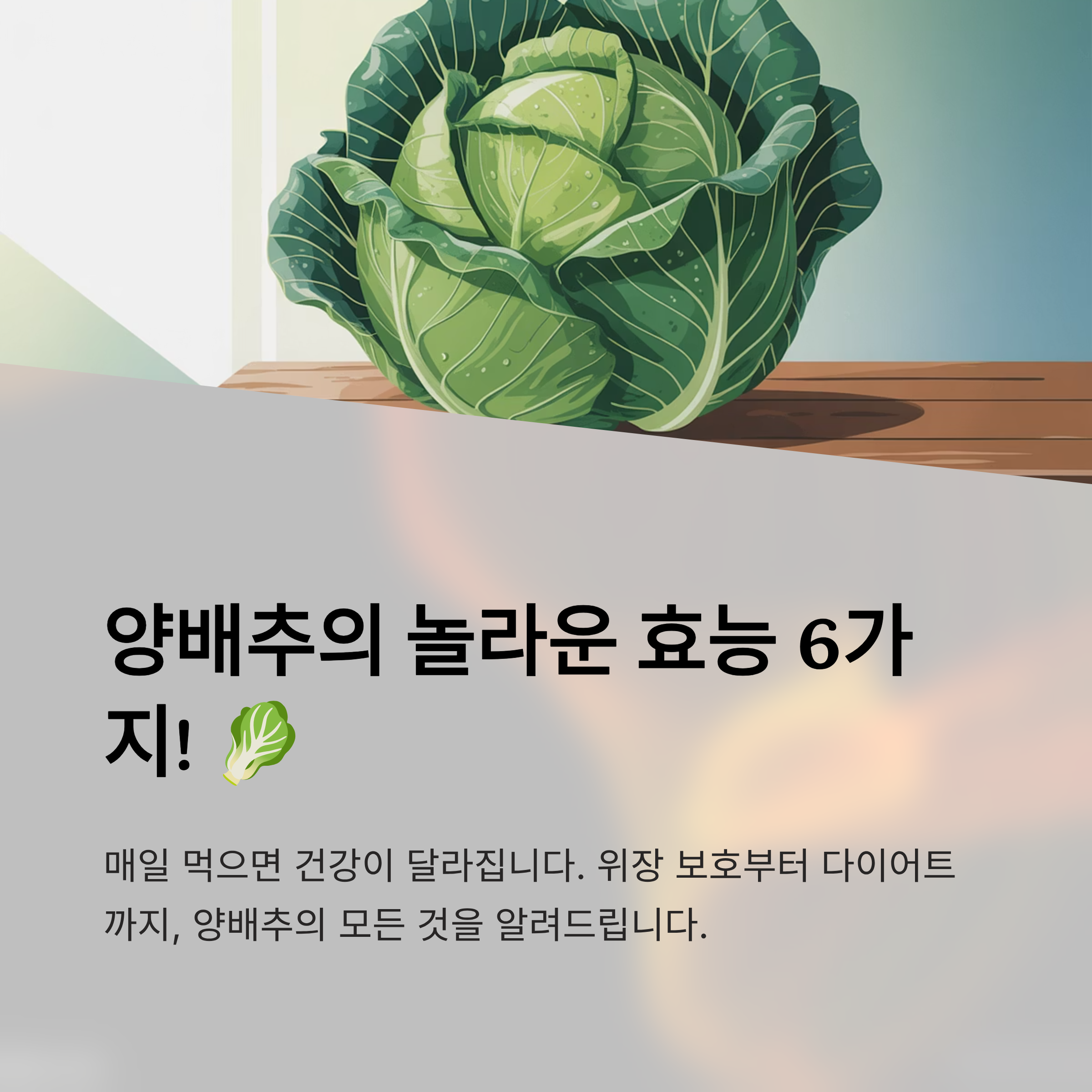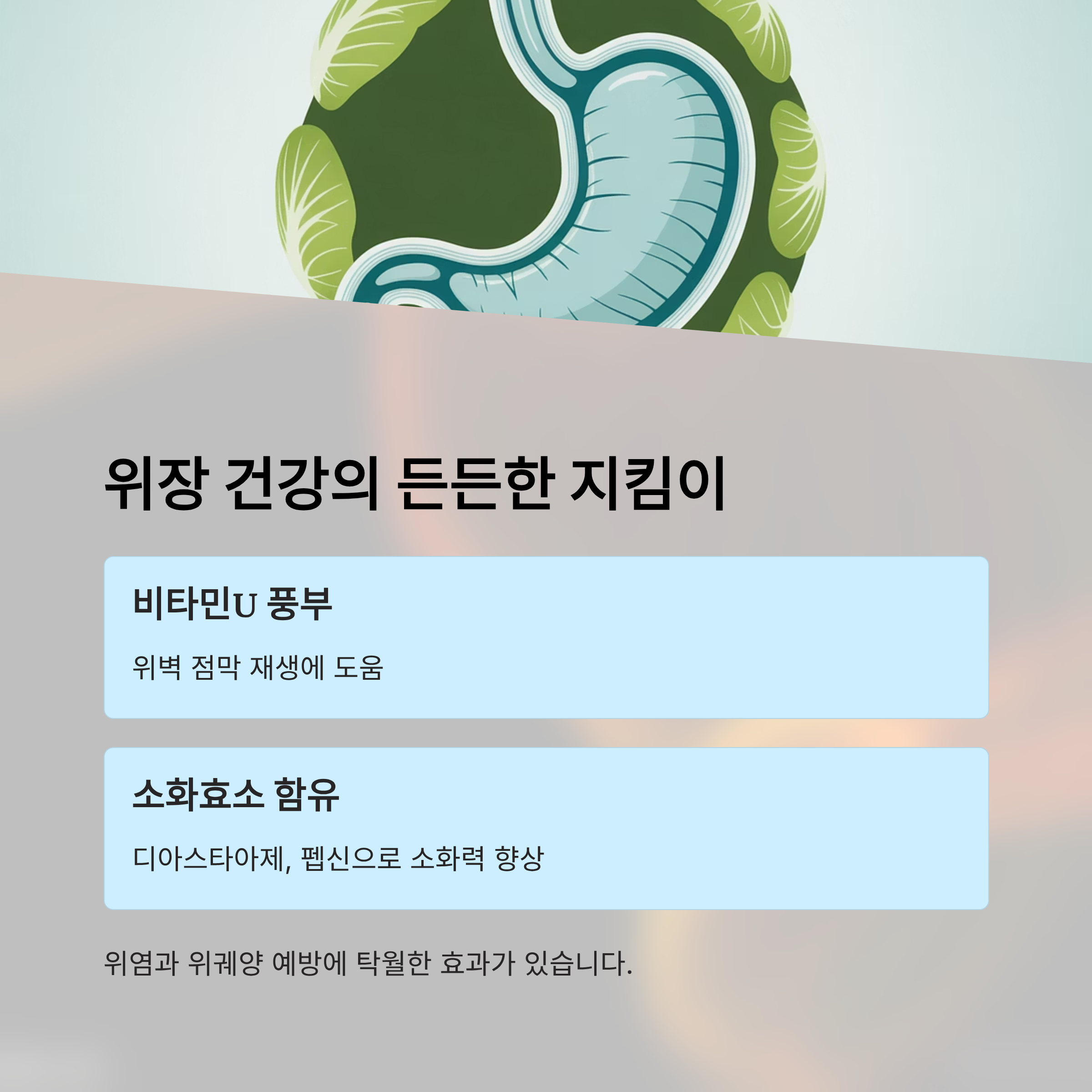 양배추에는 비타민U와 **소화효소(디아스타아제, 펩신)**가 풍부해 위벽 점막을 재생시키고, 위염·위궤양 예방 및 소화력 향상에 도움을 줍니다.