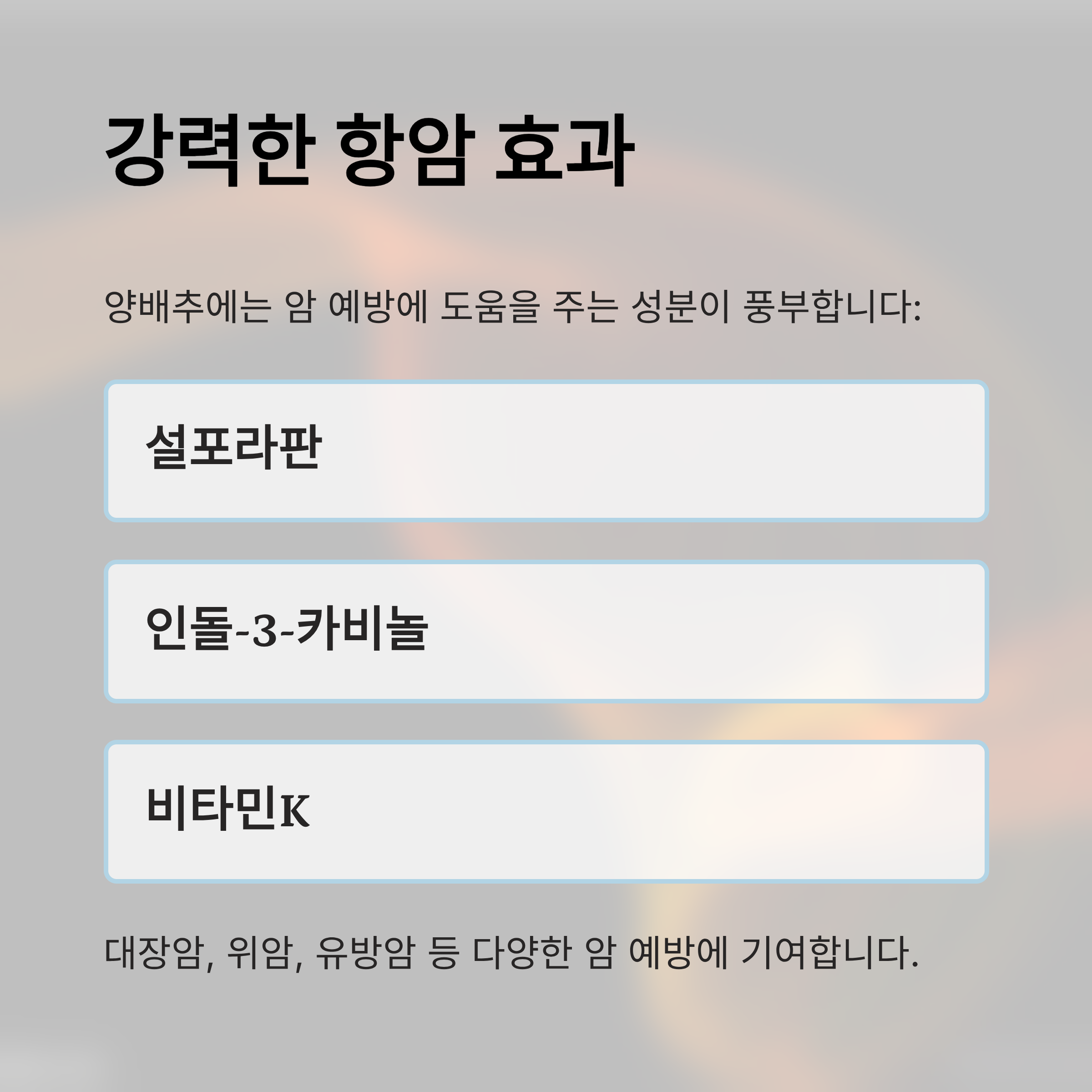 설포라판, 인돌-3-카비놀, 비타민K 등 강력한 항산화·항암 성분이 함유돼 대장암, 위암, 유방암 등 암 예방에 기여합니다.