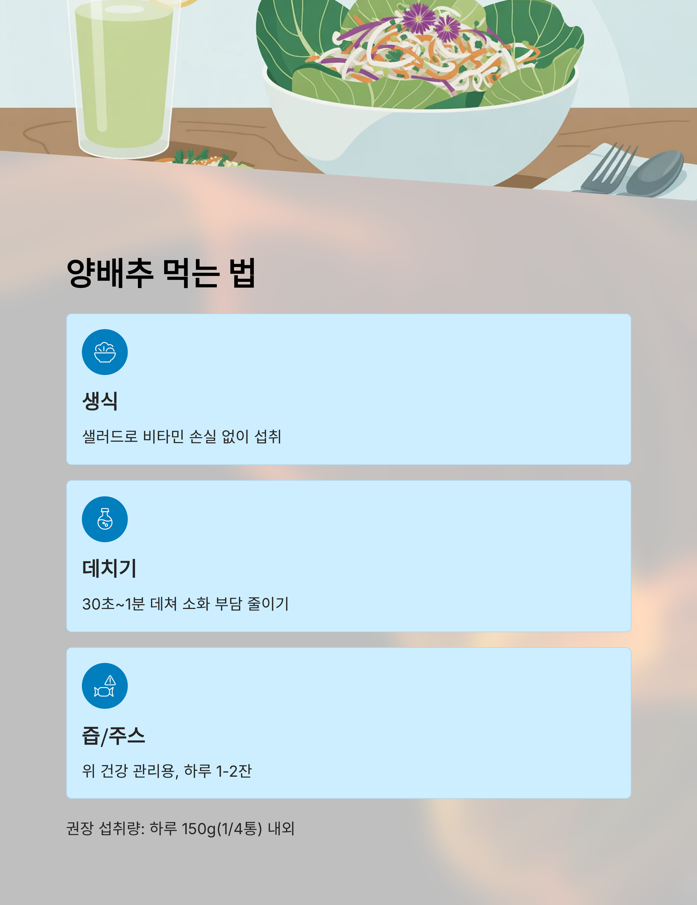 - 생식: 샐러드 형태로 비타민U·C 파괴 없이 섭취 가능(소화기 약한 사람은 피함)