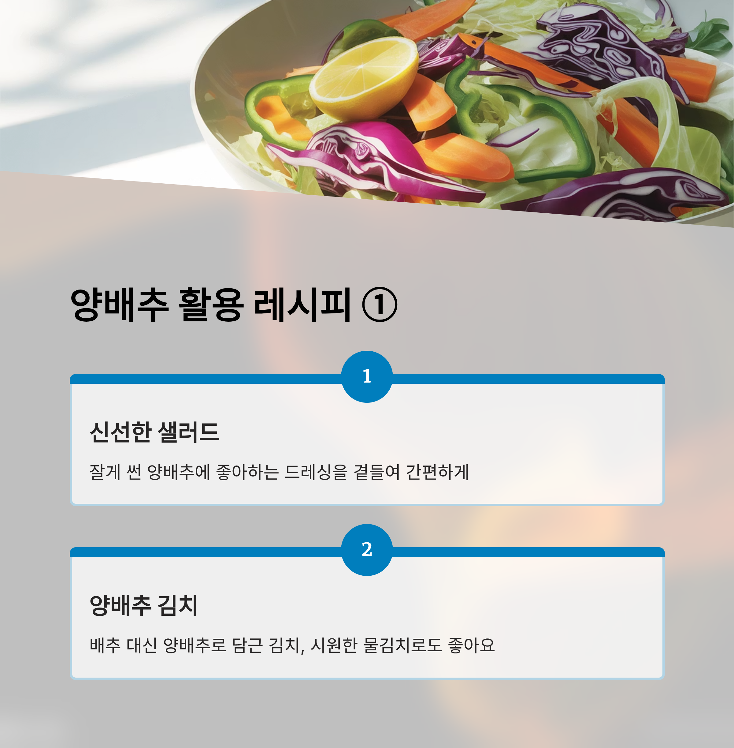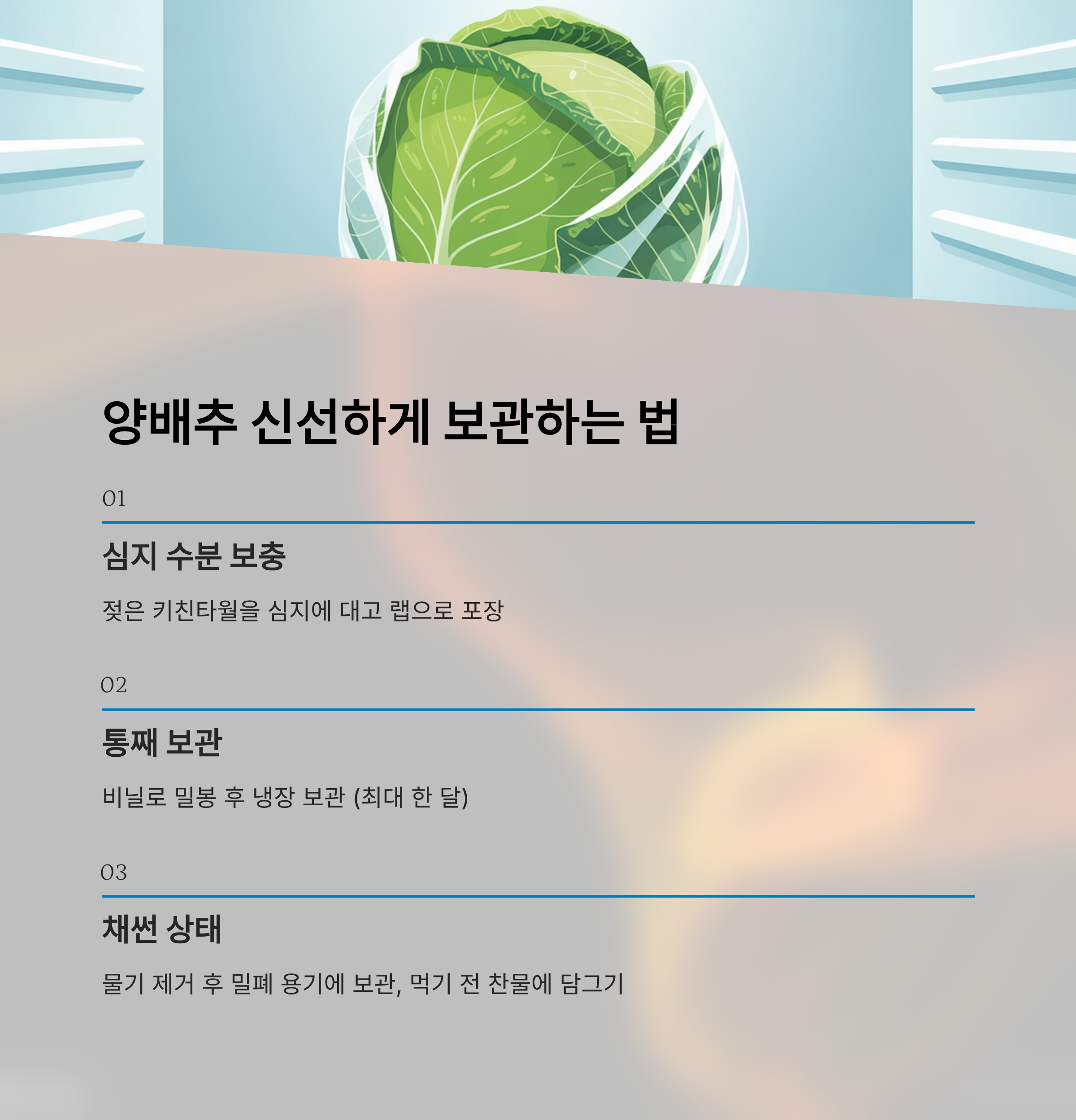 - 샐러드 & 샌드위치: 신선한 양배추를 잘게 썰어 드레싱과 함께