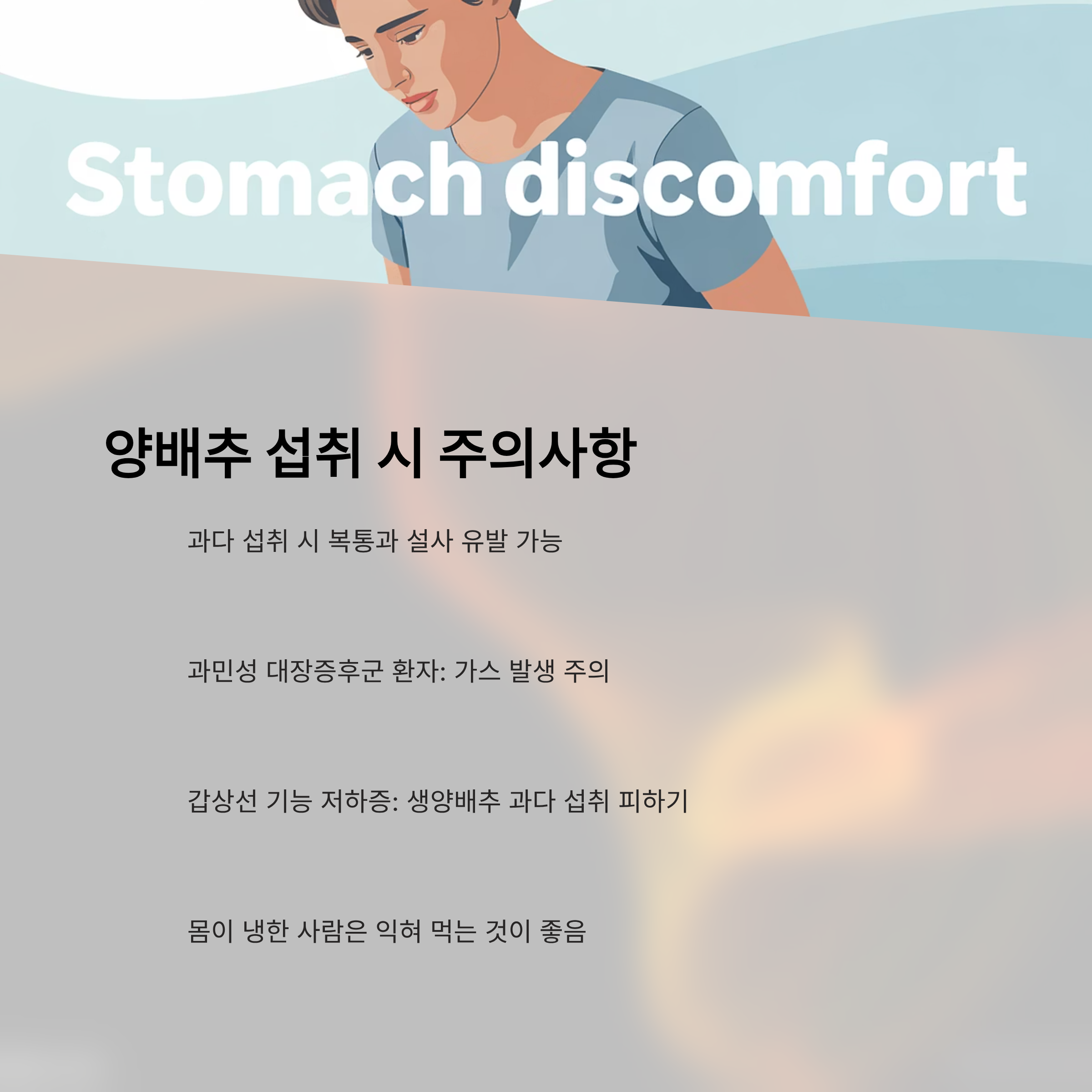 - 갑상선 기능 저하증 환자: 생양배추 과다 섭취 시 호르몬 합성 저해 가능(익히면 완화)