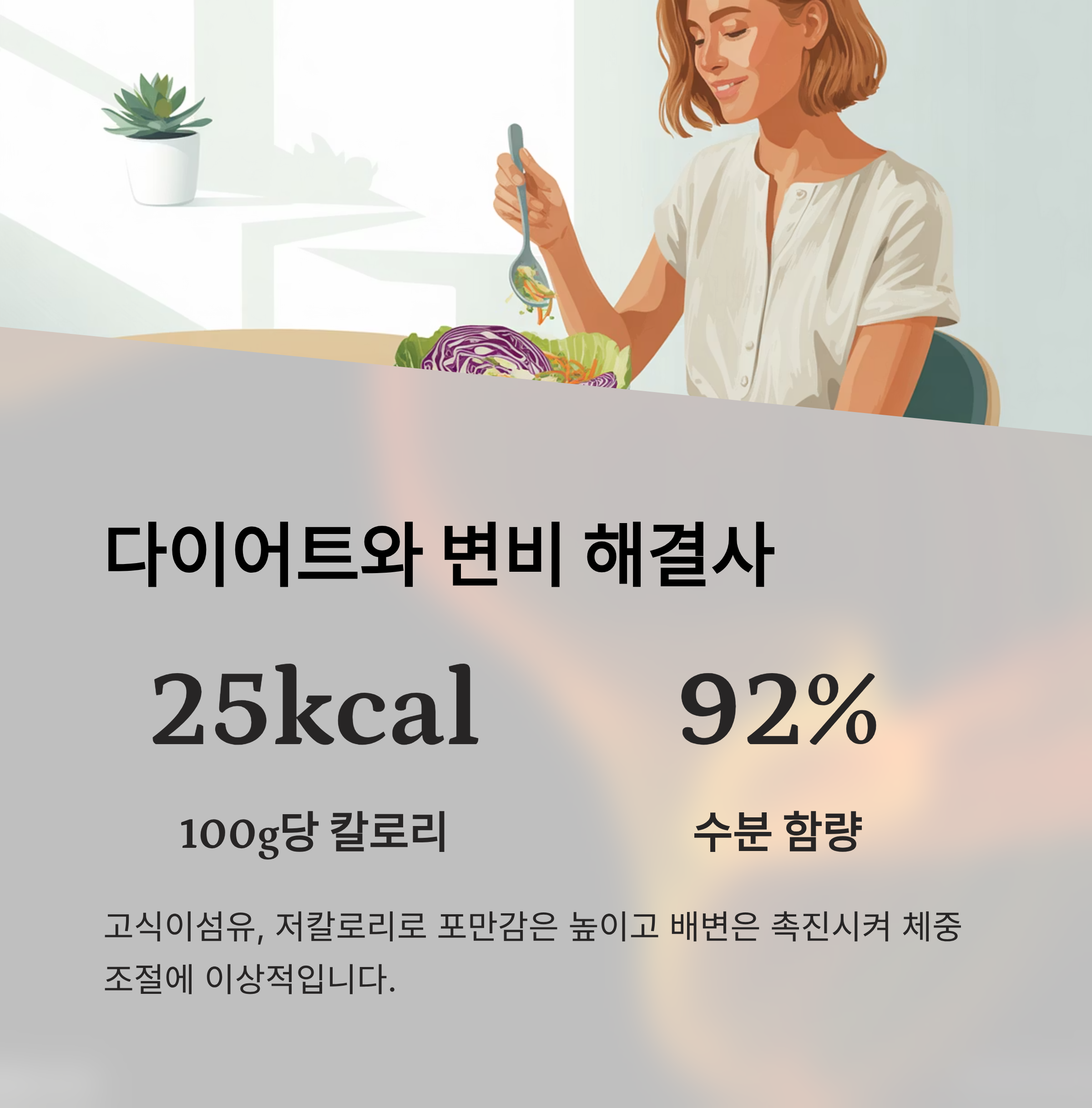 저칼로리(100g당 약 25kcal)·고식이섬유·다량의 수분 함유로 포만감 유지와 배변 촉진, 체중 조절에 유리합니다.