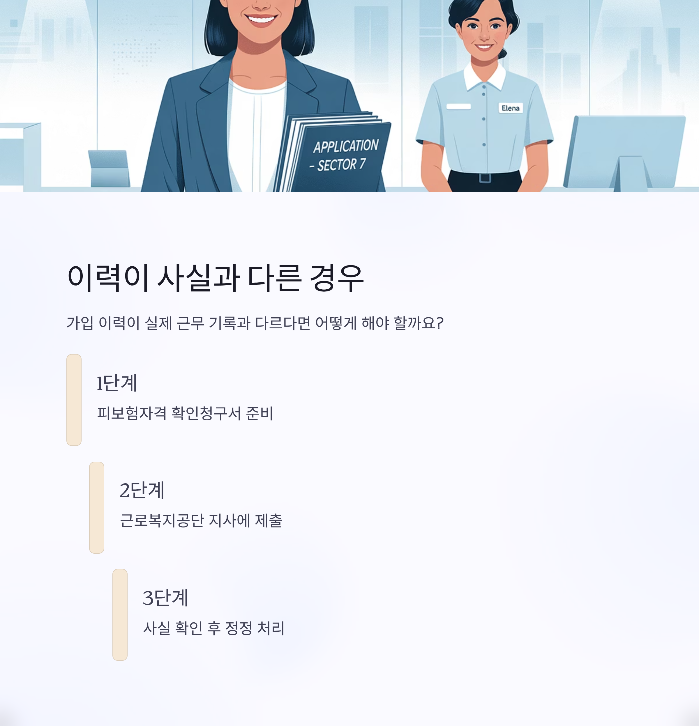 - 이력이 사실과 다른 경우 피보험자격 확인청구서를 근로복지공단 지사에 제출해야 합니다.