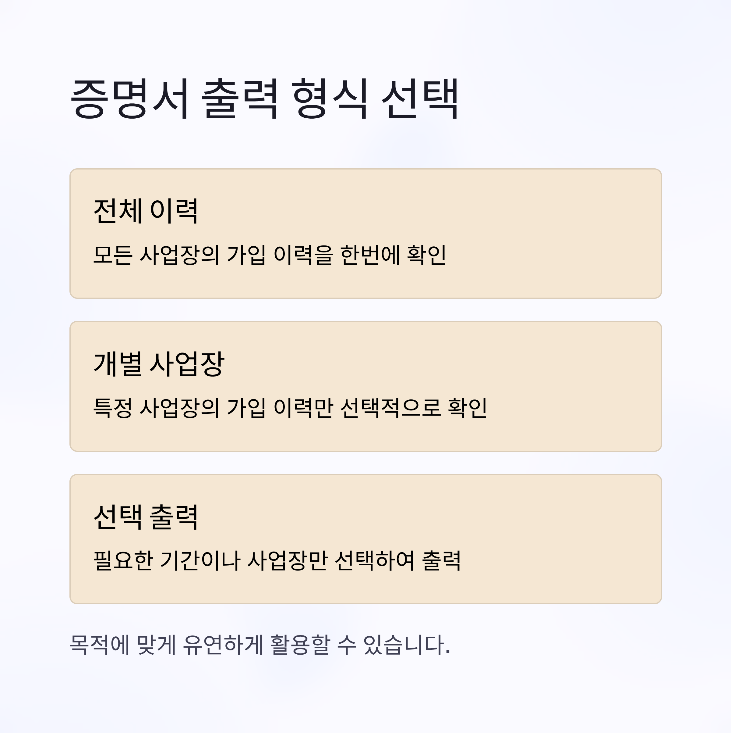 - 증명서 출력 형식을 전체, 개별사업장별 또는 선택할 수 있어 유연하게 활용 가능합니다.
