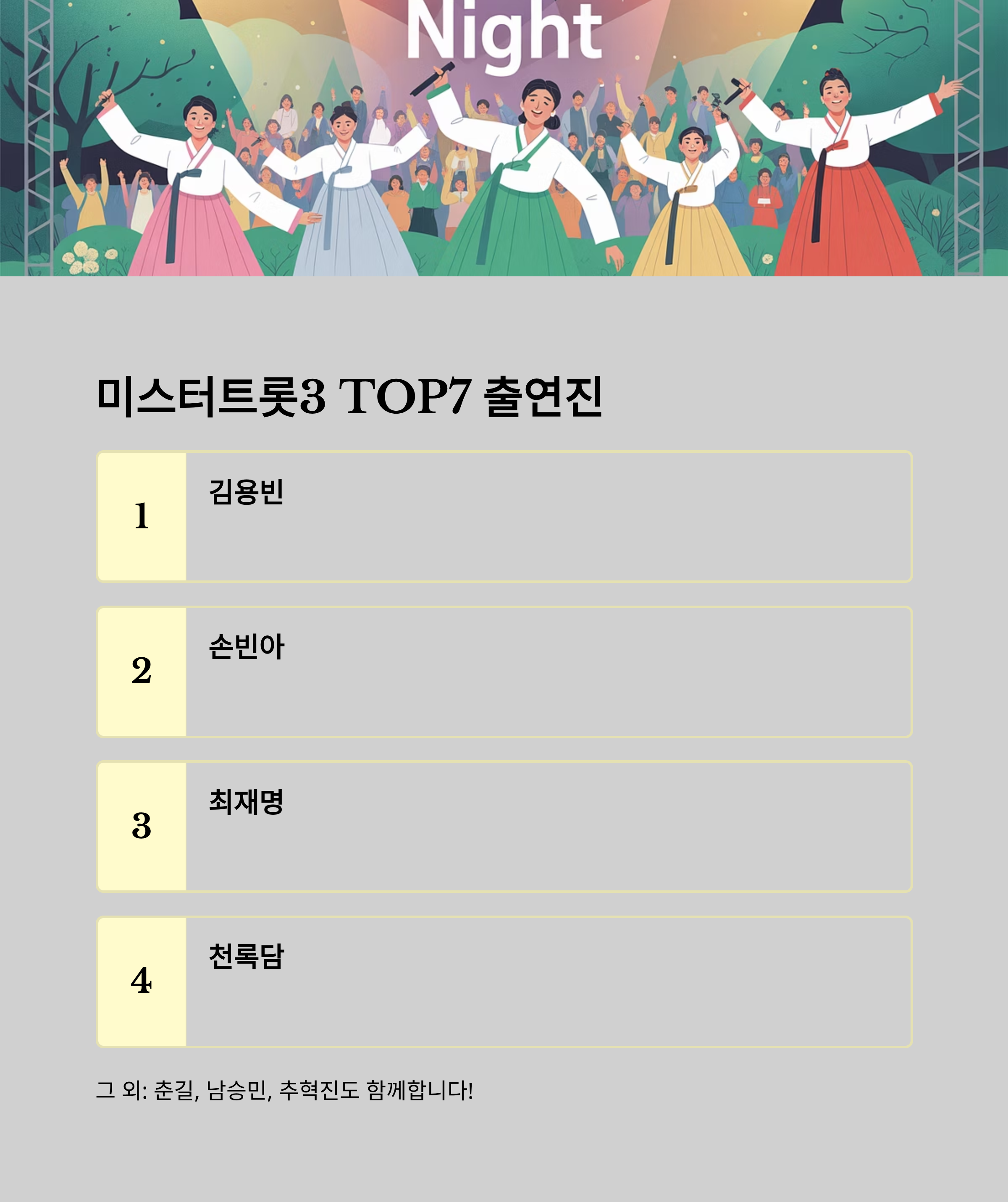 - 미스터트롯3 TOP7: 김용빈, 손빈아, 최재명, 천록담, 춘길, 남승민, 추혁진
