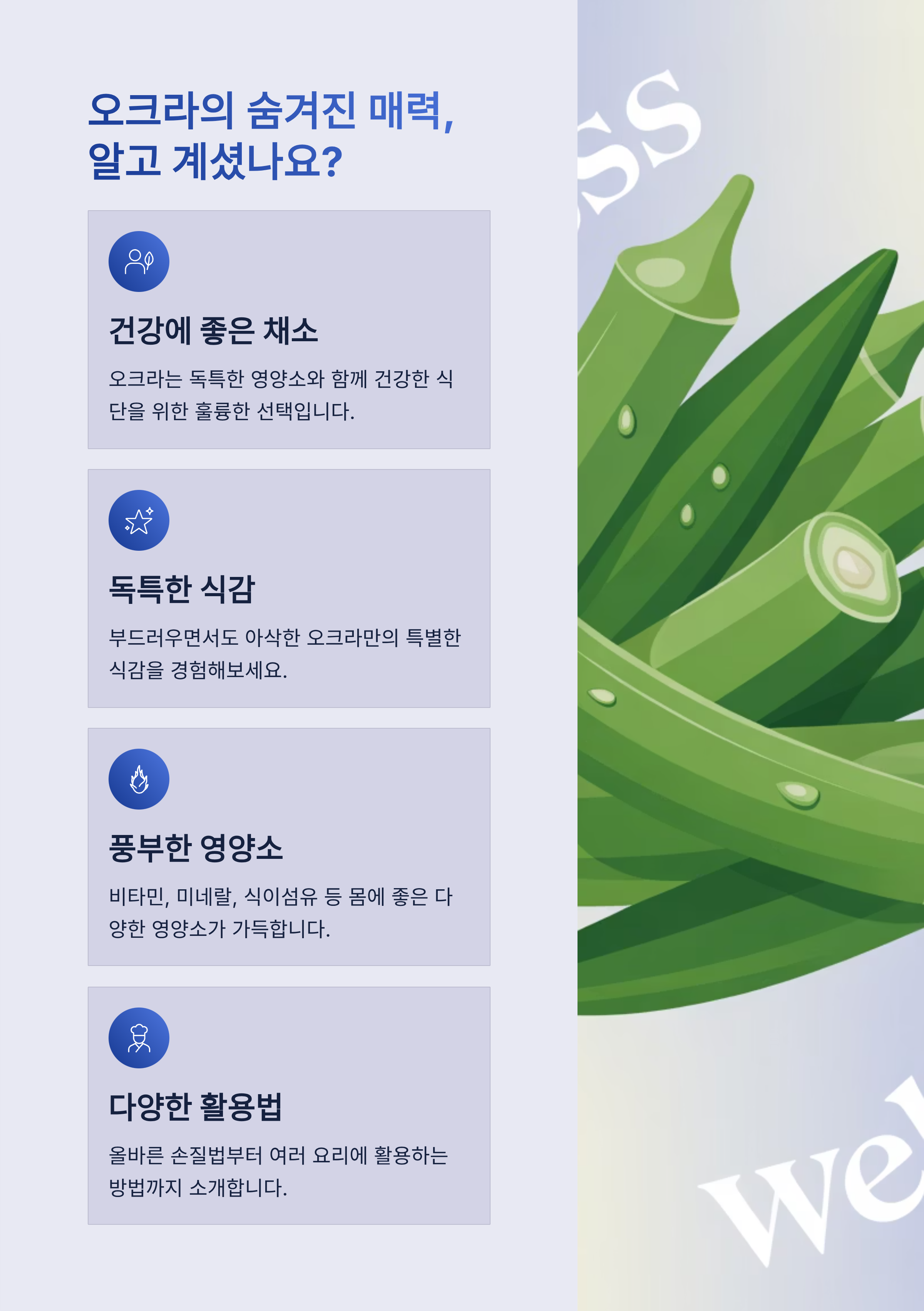 오크라는 끈적한 식감과 풍부한 영양이 매력적인 채소입니다.