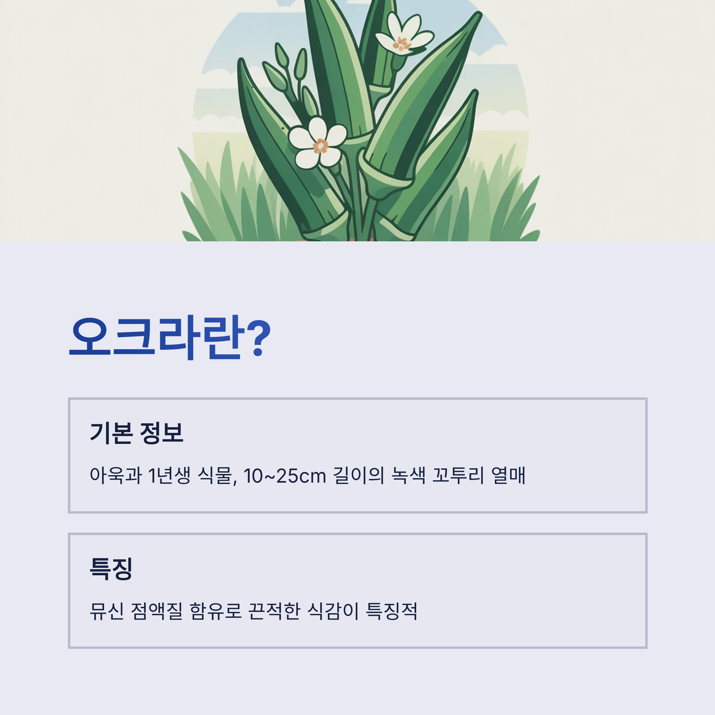 - 아욱과에 속하는 1년생 식물로, 10~25cm 길이의 녹색 꼬투리 열매를 식용