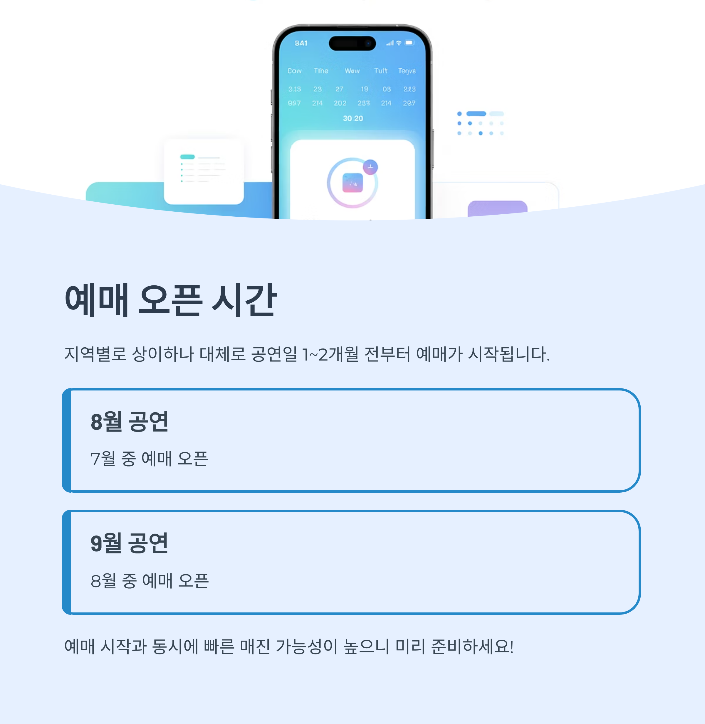 - 예: 8월 공연은 7월 중, 9월 공연은 8월 중 예매 오픈