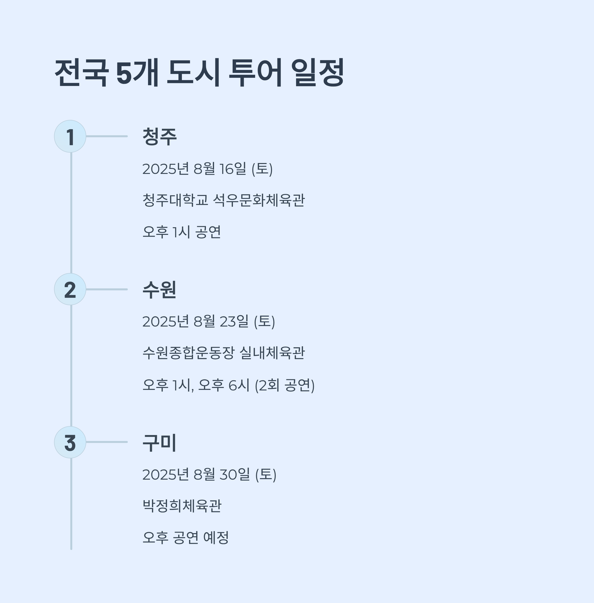 | 구미 | 2025년 8월 30일 (토) | 박정희체육관 | 오후 공연 예정 |