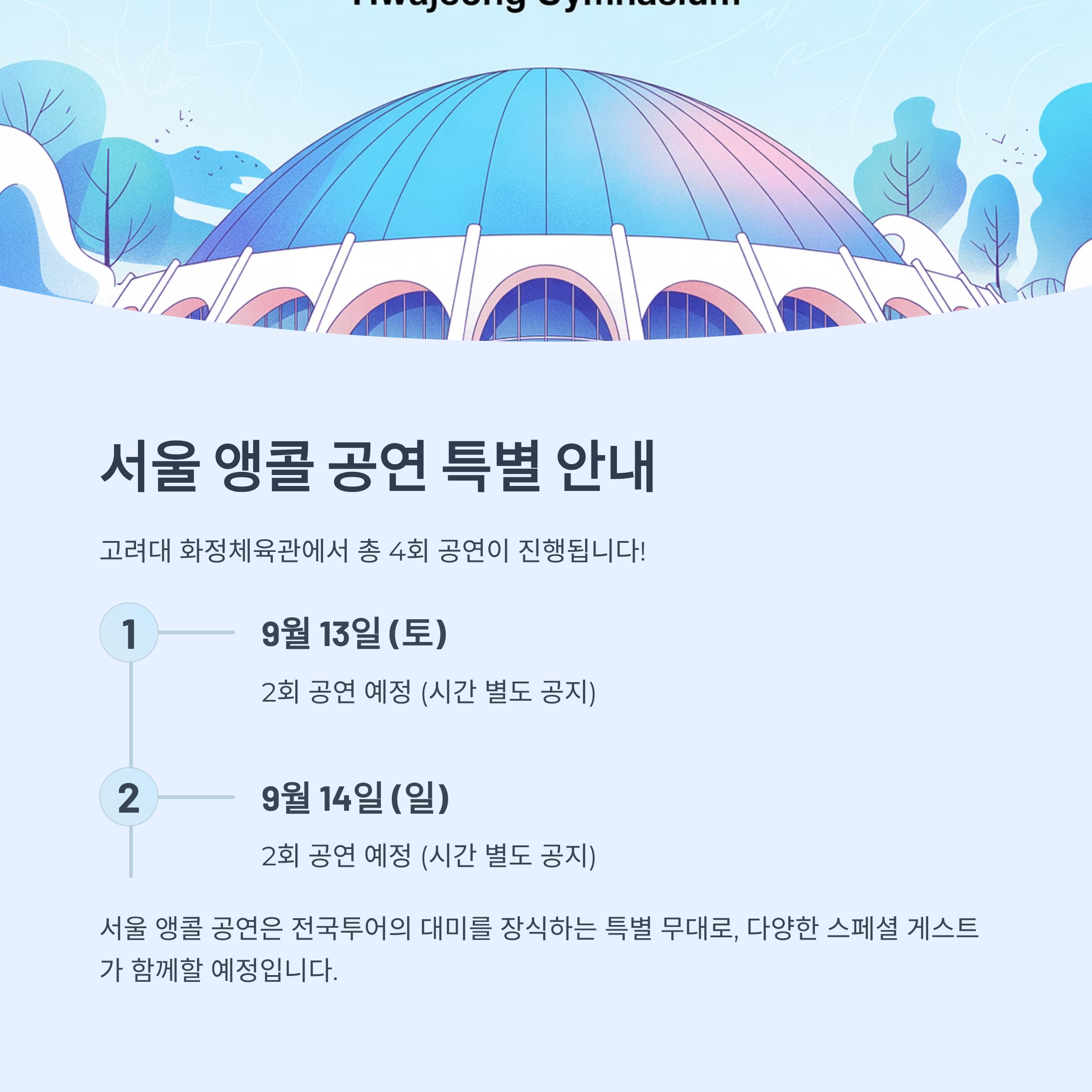 | 서울 (앵콜) | 2025년 9월 13~14일 | 고려대 화정체육관 | 4회 공연 (상세 시간 별도 공지) |