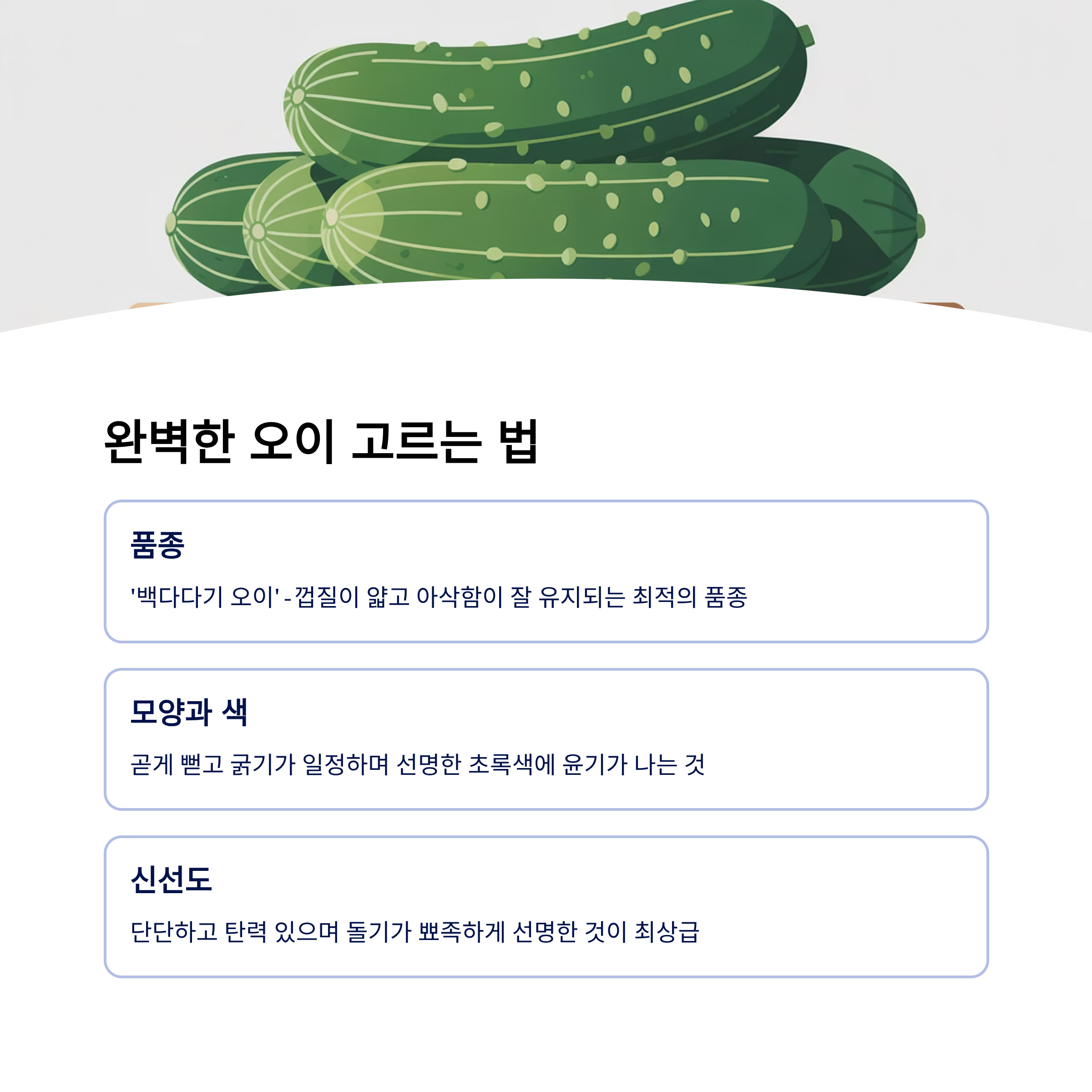 - 모양/크기: 곧게 뻗고, 굵기가 전체적으로 일정한 오이 선택. 구부러지거나 한쪽만 굵은 것은 피하세요.