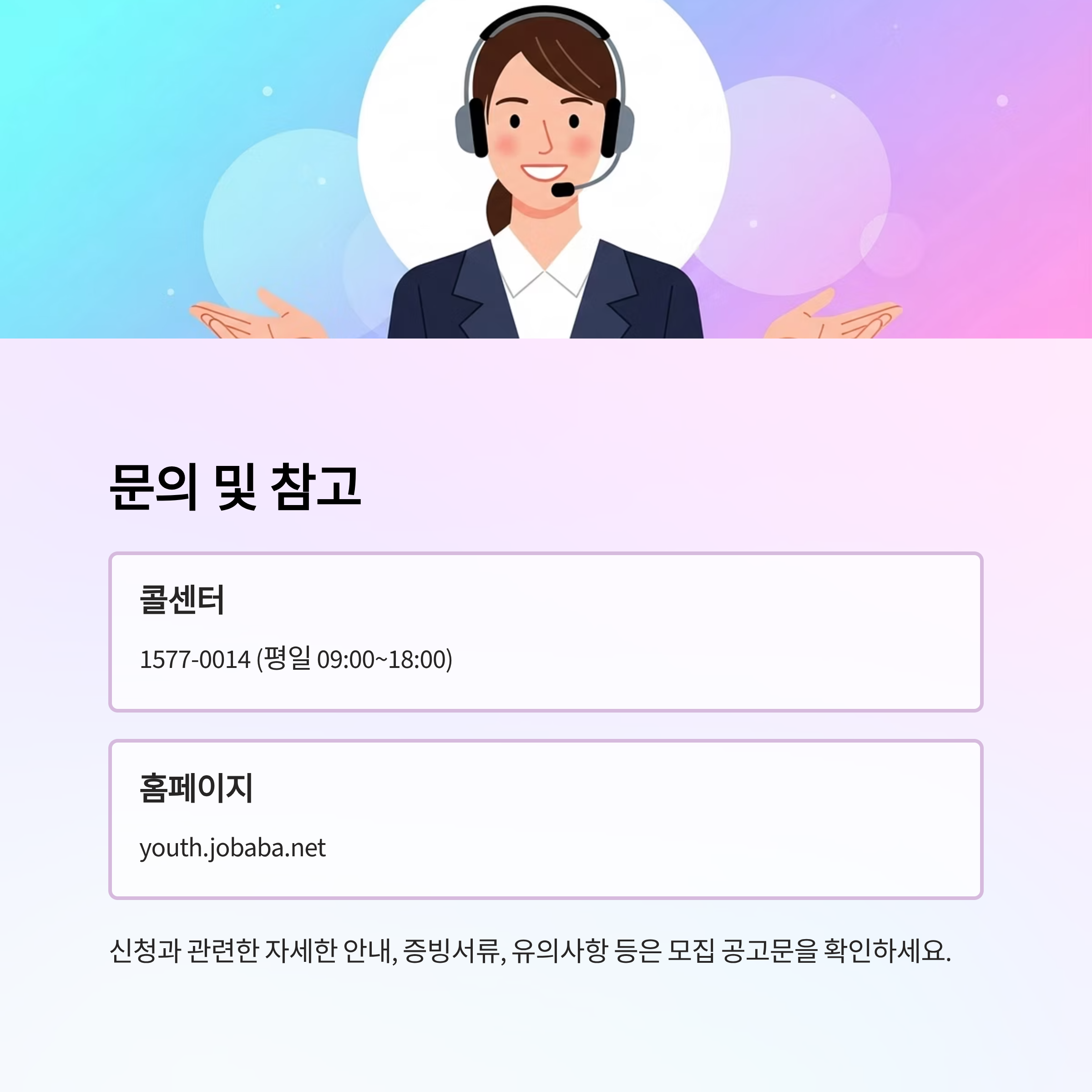 - 경기도일자리재단 청년노동자 지원사업 콜센터: 1577-0014 (평일 09:00~18:00)