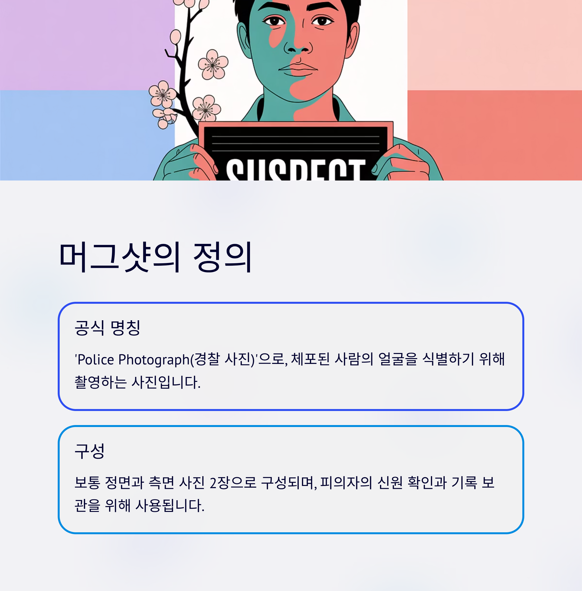 머그샷(mug shot)은 체포된 사람의 얼굴을 식별하기 위해 촬영하는 사진을 말합니다.