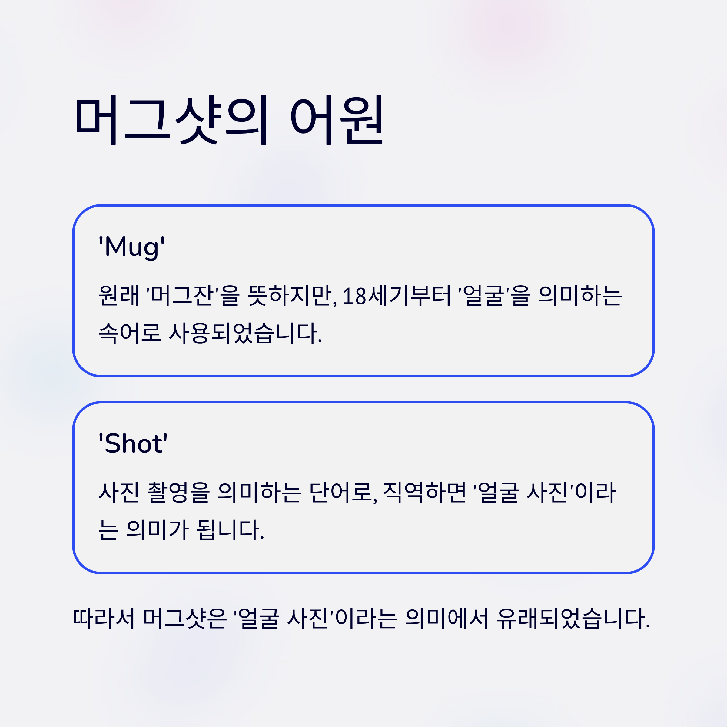- 어원: ‘mug’는 원래 ‘머그잔’을 뜻하지만, 18세기부터 ‘얼굴’을 의미하는 속어로 사용되었습니다.