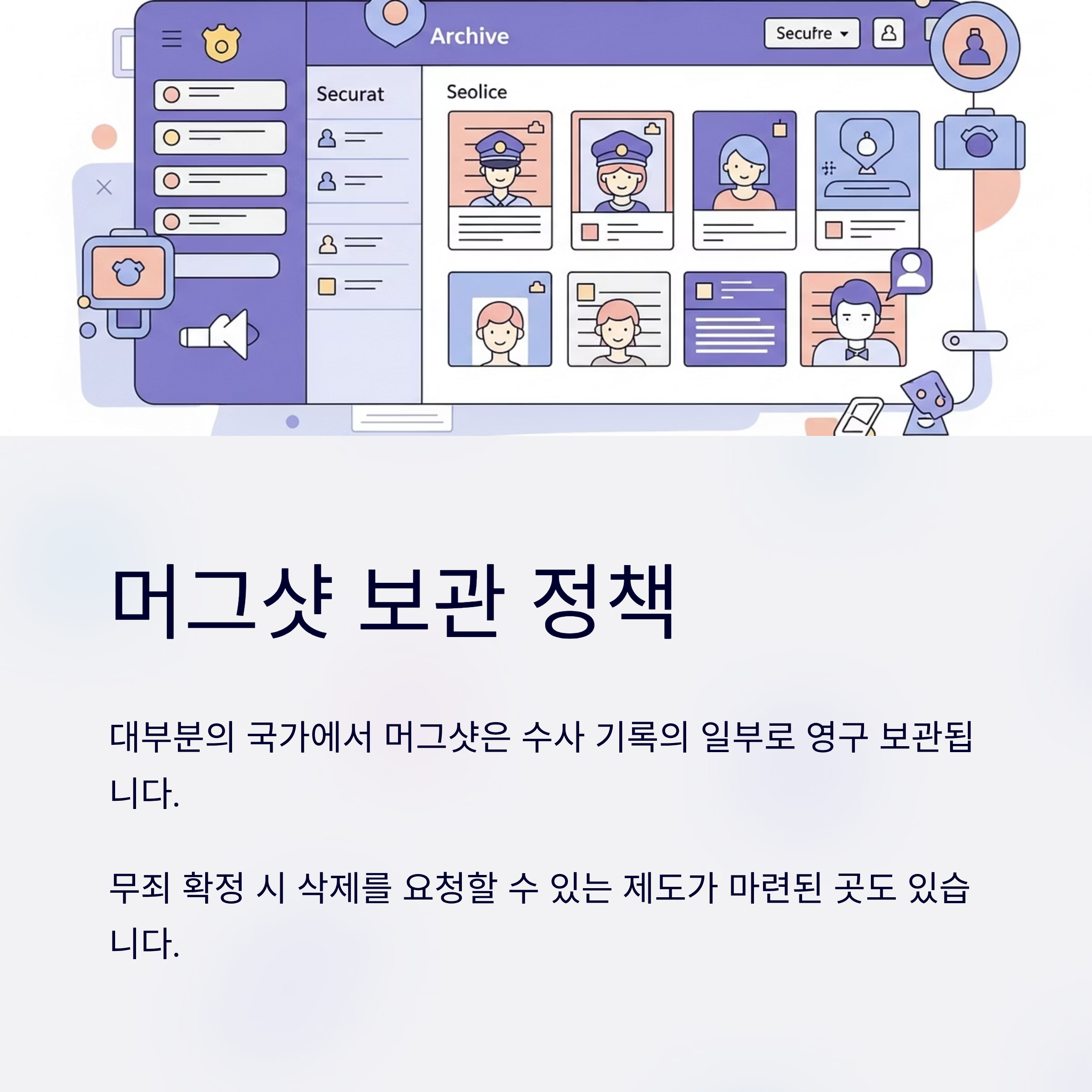 → 대부분의 국가에서 머그샷은 수사 기록의 일부로 영구 보관되지만, 무죄 확정 시 삭제를 요청할 수 있는 제도가 마련된 곳도 있습니다.