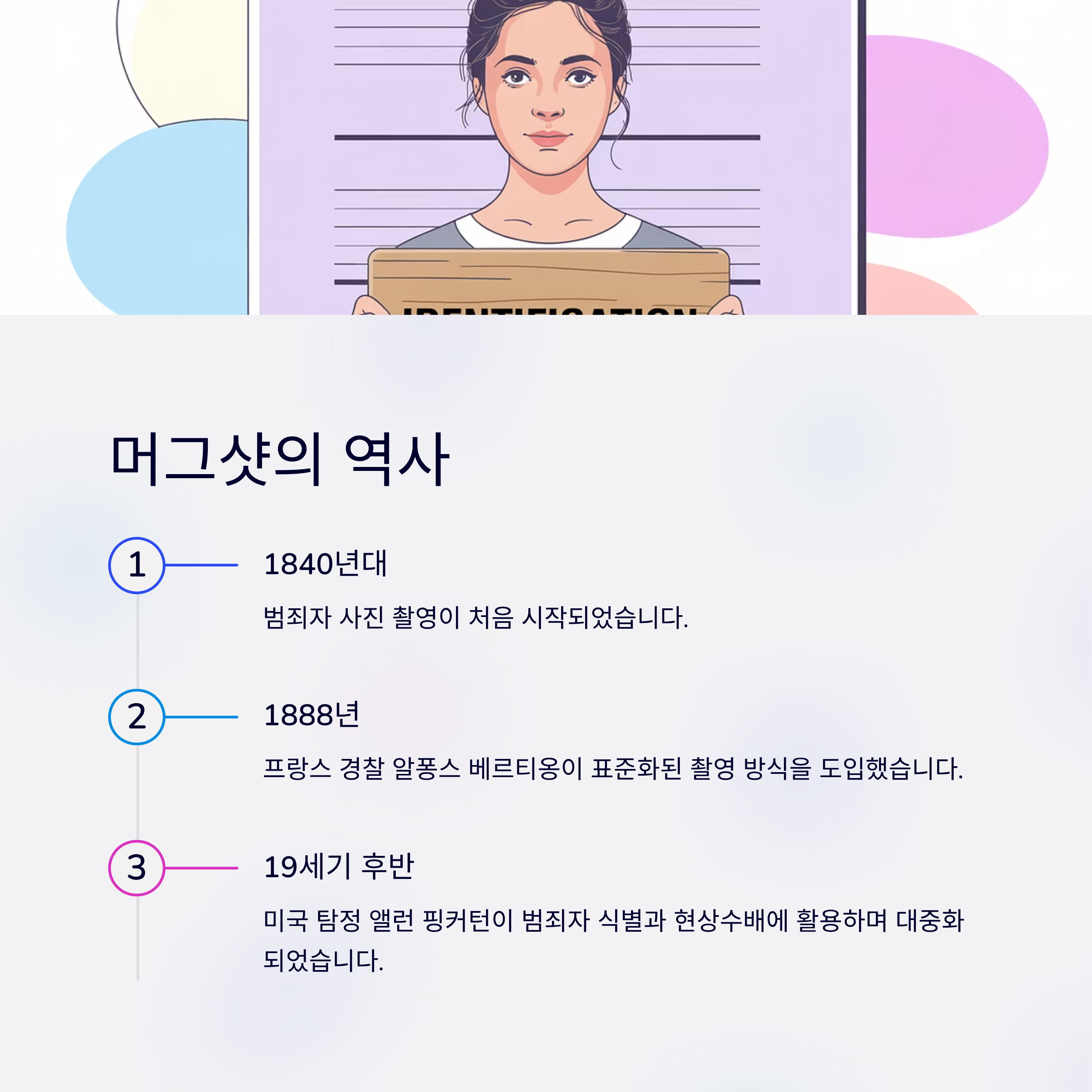 - 역사: 1840년대 범죄자 촬영이 시작됐고, 1888년 프랑스 경찰 알퐁스 베르티옹이 표준화된 촬영 방식을 도입했습니다.