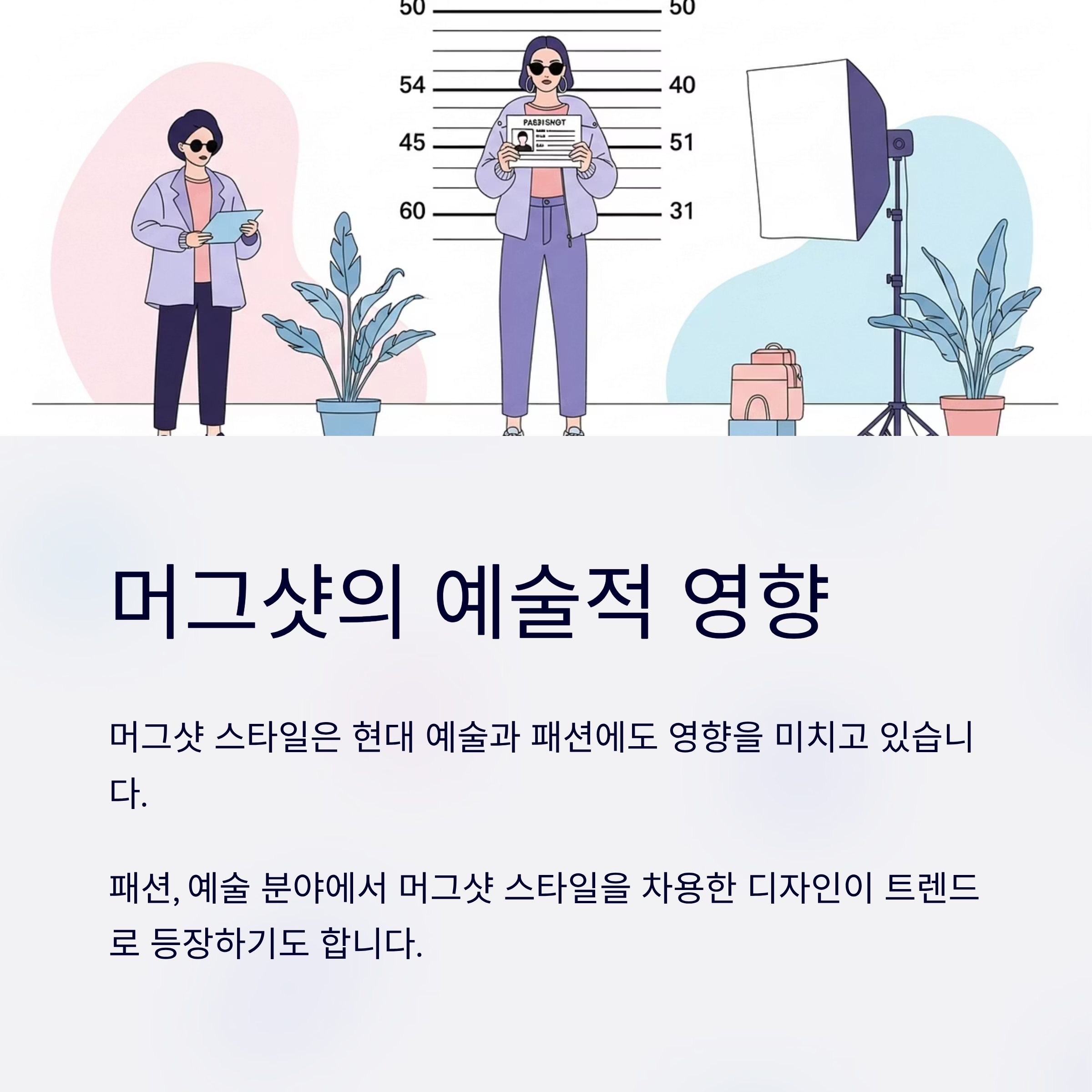 최근에는 패션, 예술 분야에서 머그샷 스타일을 차용한 디자인도 등장하고 있습니다.