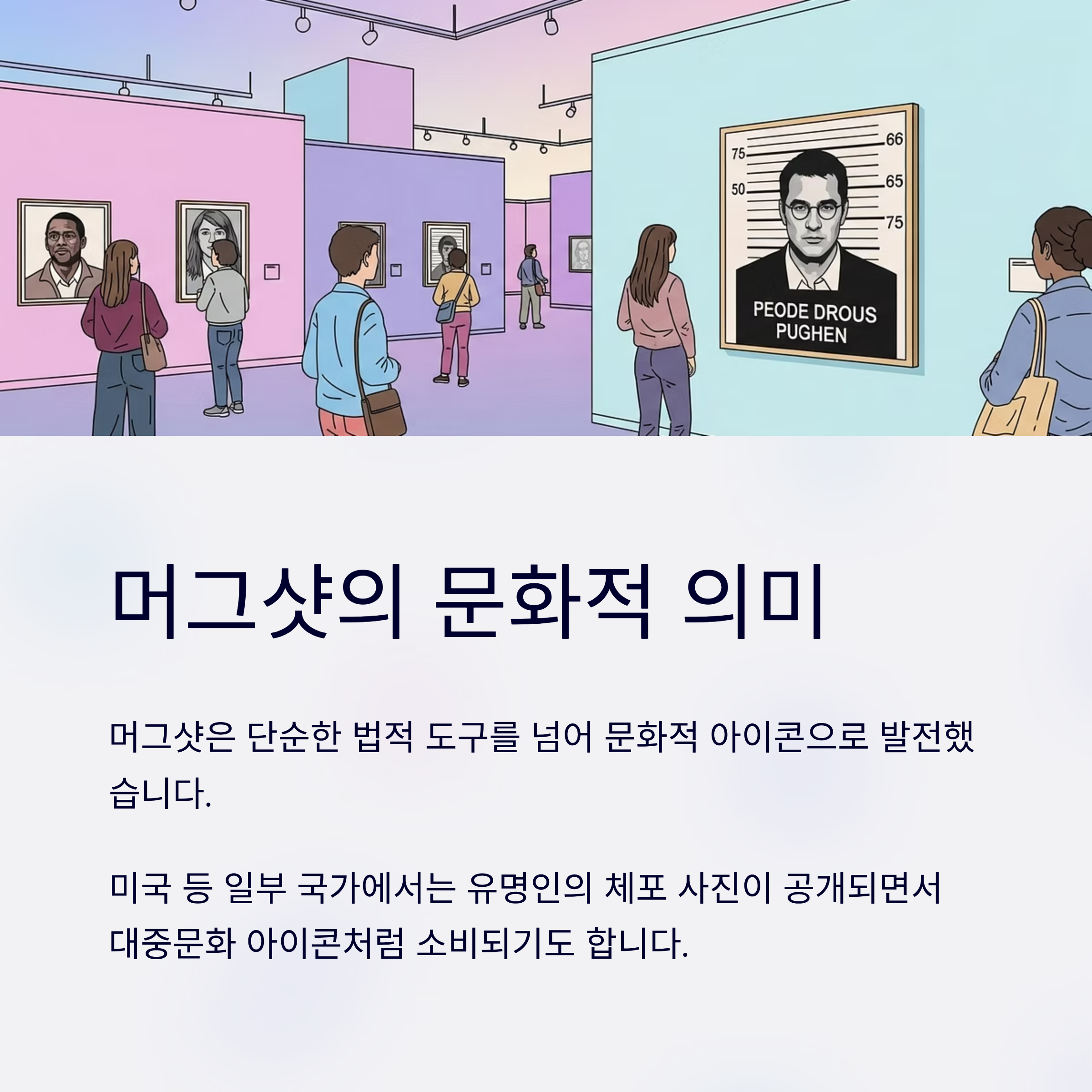 범죄 사건뿐 아니라 유명인의 체포 사진이 공개되면서 대중문화 아이콘처럼 소비되기도 했습니다.