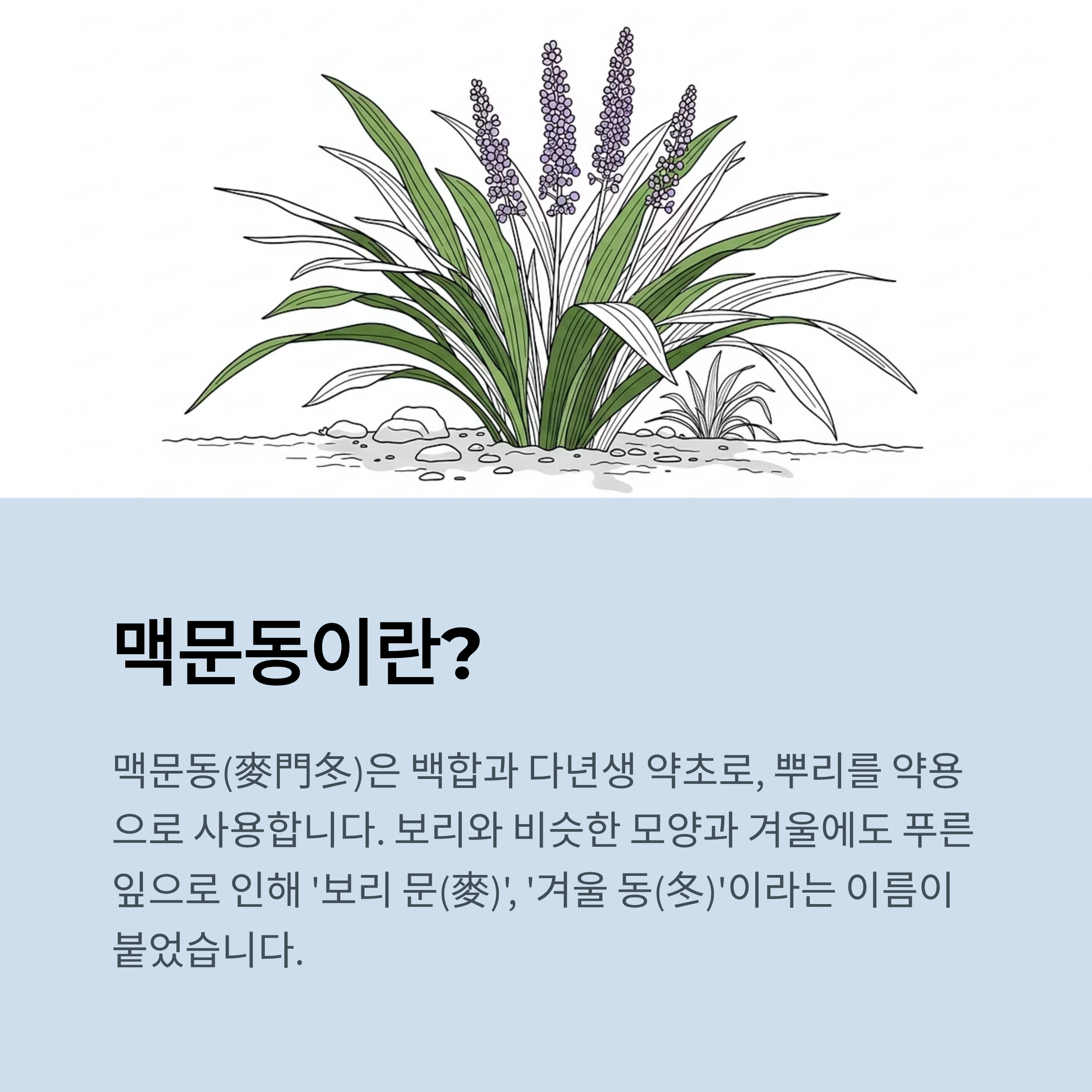 맥문동(麥門冬, Liriope platyphylla)은 백합과에 속하는 다년생 약초로, 뿌리(괴근)를 약용으로 사용하는 전통 한방 재료입니다. 뿌리 모양이 보리와 비슷하고 겨울에도 잎이 푸르러 ‘보리 문(麥)’, ‘겨울 동(冬)’이라는 이름이 붙었습니다. 한의학에서는 기관지와 폐를 촉촉하게 하고 진액을 보충하는 약초로 알려져 있습니다.