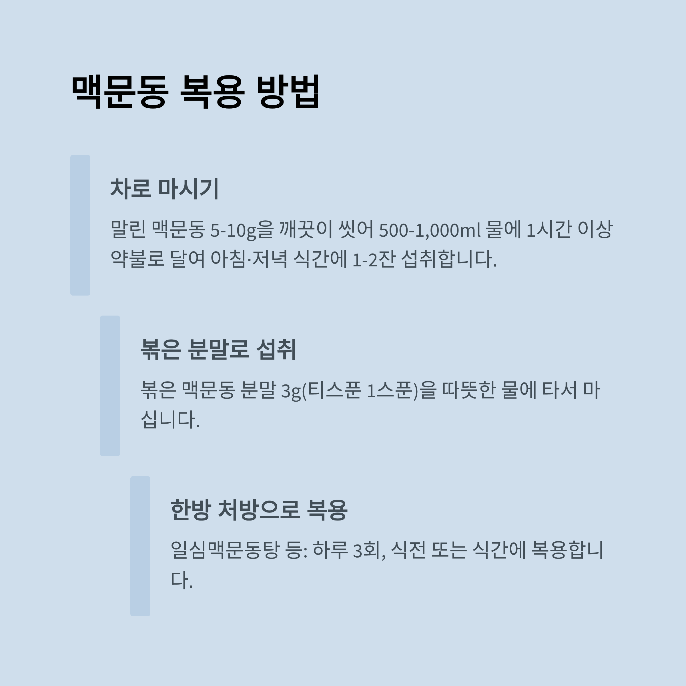 - 말린 맥문동 5~10g → 깨끗이 씻기 → 500~1,000ml 물에 1시간 이상 약불로 달임