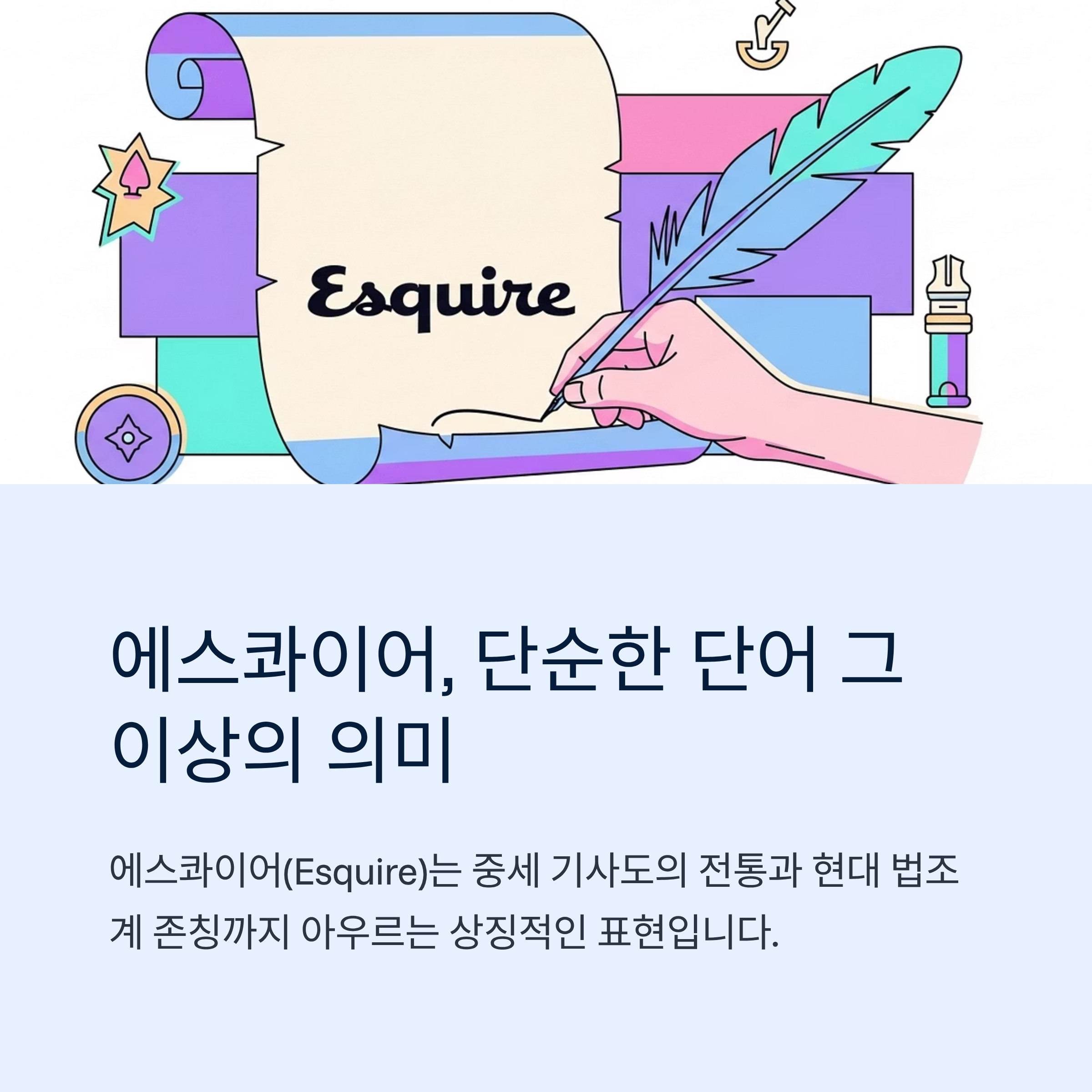 👉 결론적으로, "에스콰이어(Esquire)"는 단순한 단어가 아니라 중세 기사도의 전통과 현대 법조계 존칭까지 아우르는 상징적인 표현입니다.