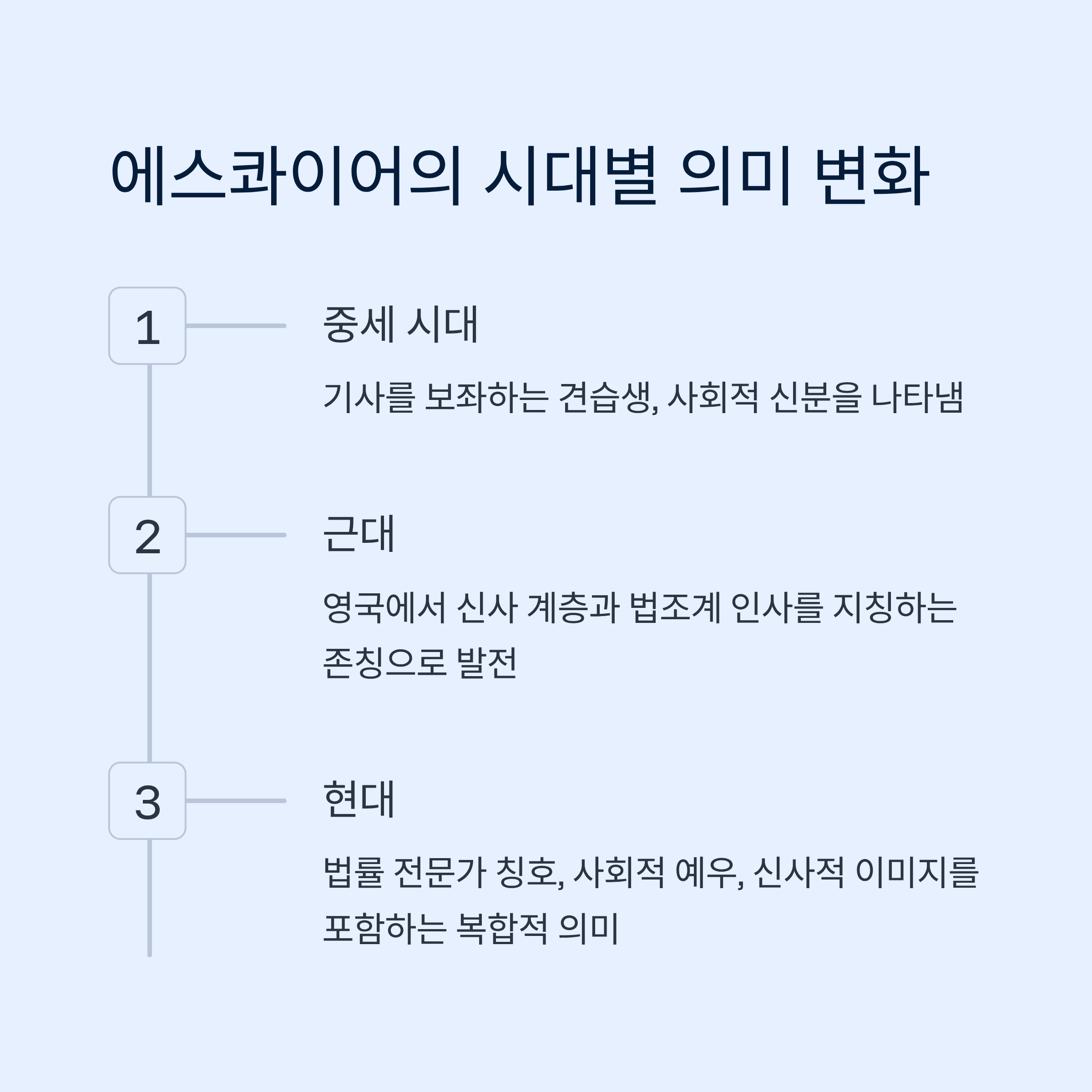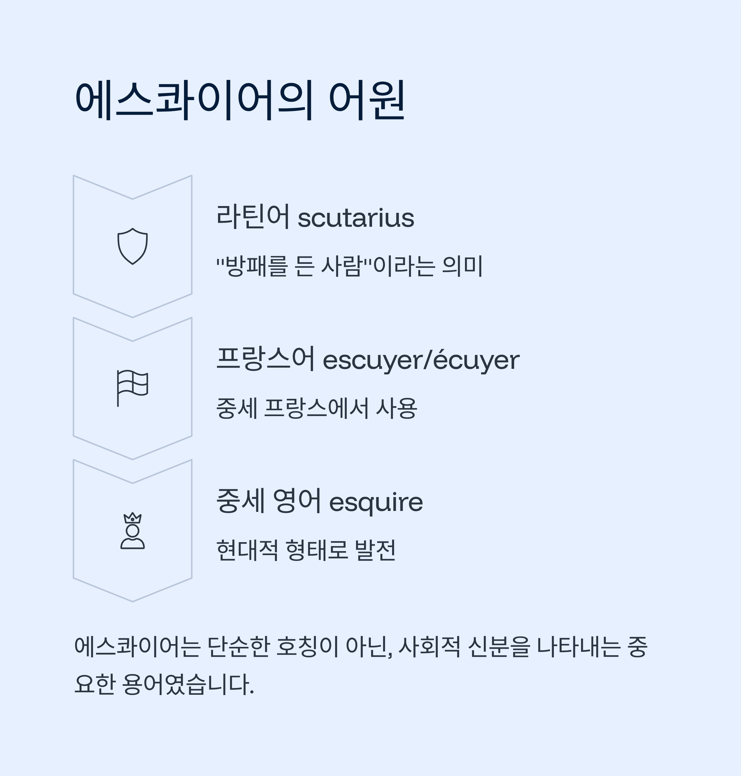 - 어원은 라틴어 scutarius(방패를 든 사람) → 프랑스어 escuyer/écuyer → 중세 영어 esquire로 이어졌습니다.