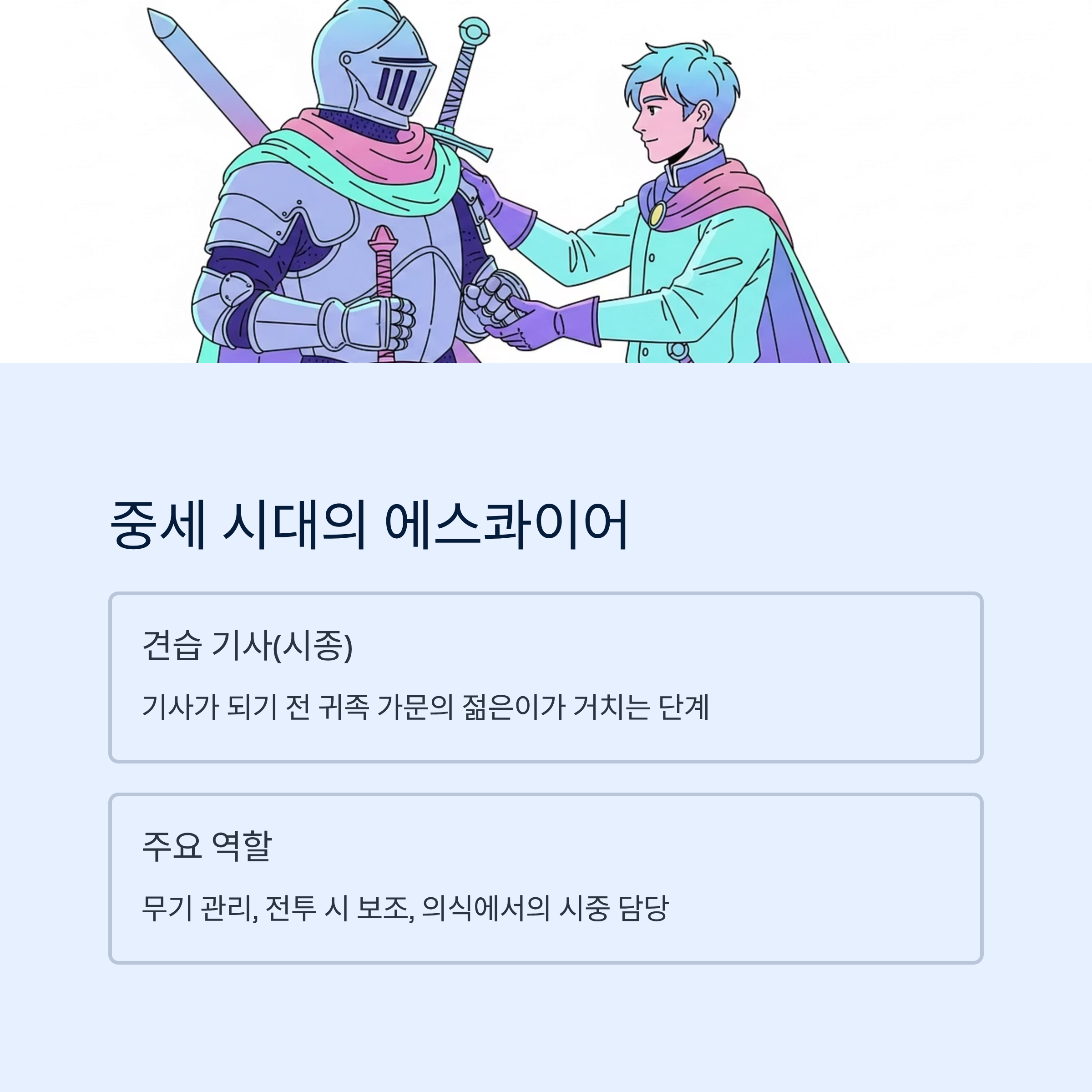 기사(knight)가 되기 전, 귀족 집안의 젊은 남성은 **에스콰이어(견습 기사)**라는 신분으로 무기 관리, 전투 시 보조, 의식에서의 시중을 담당했습니다. - 사회적 신분