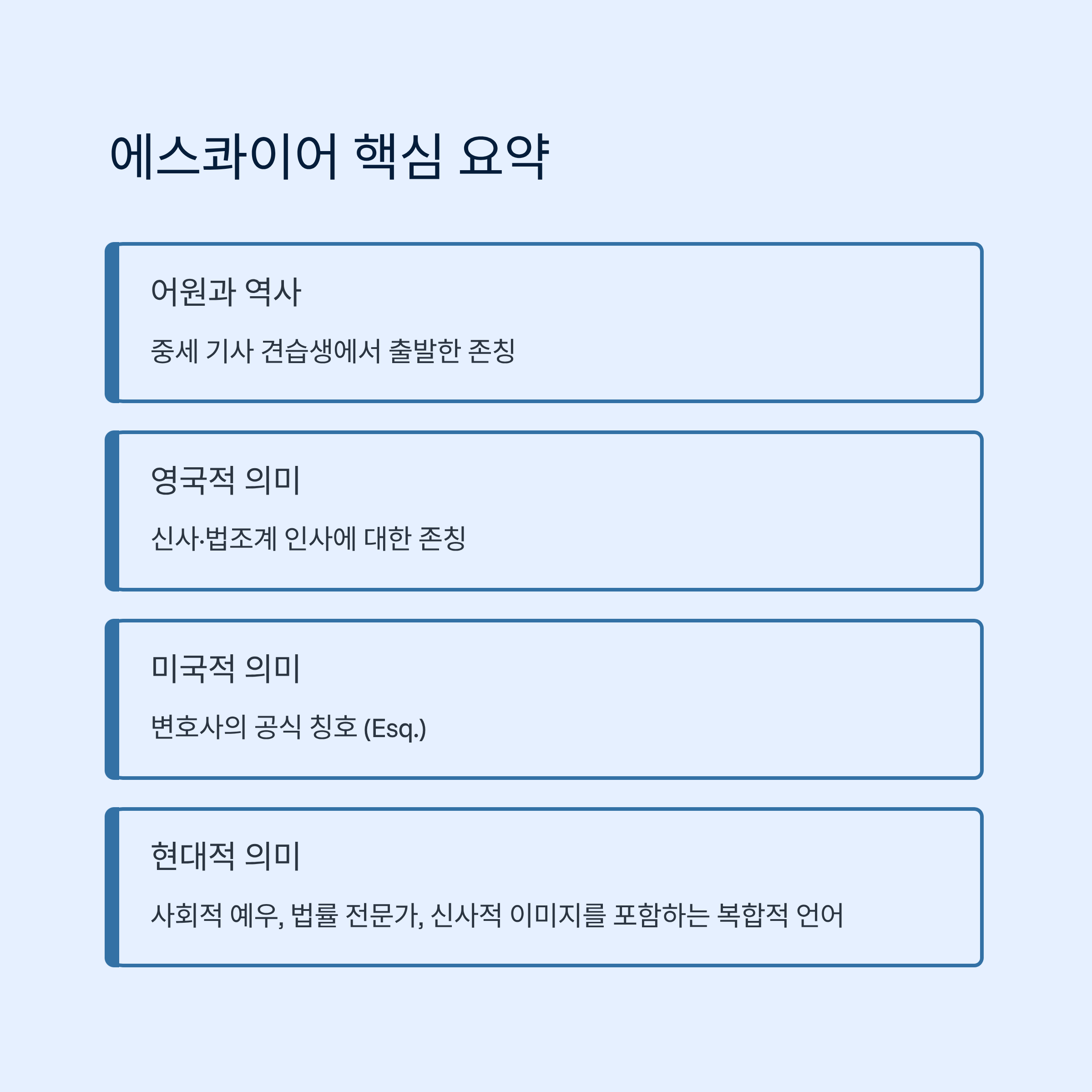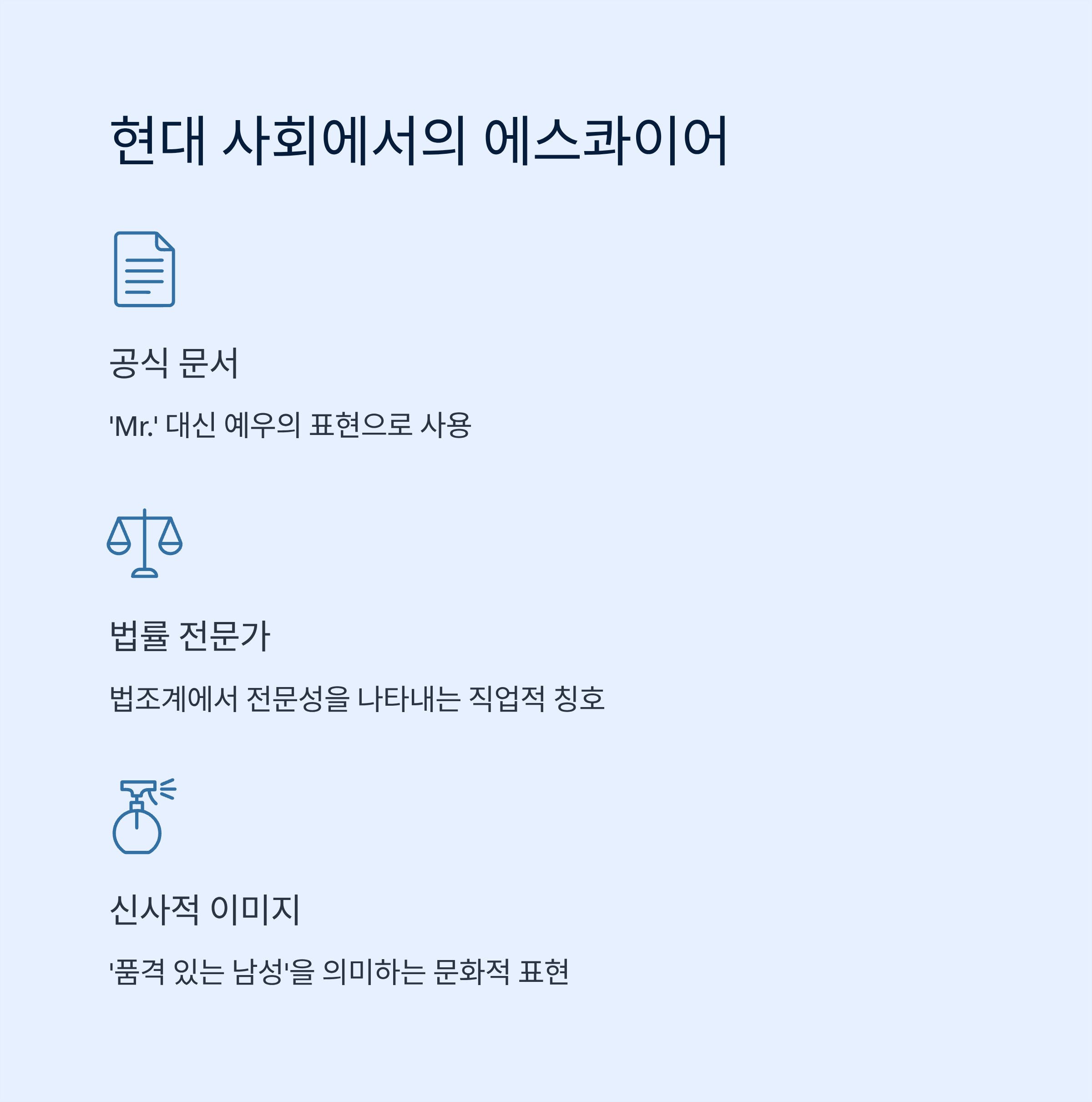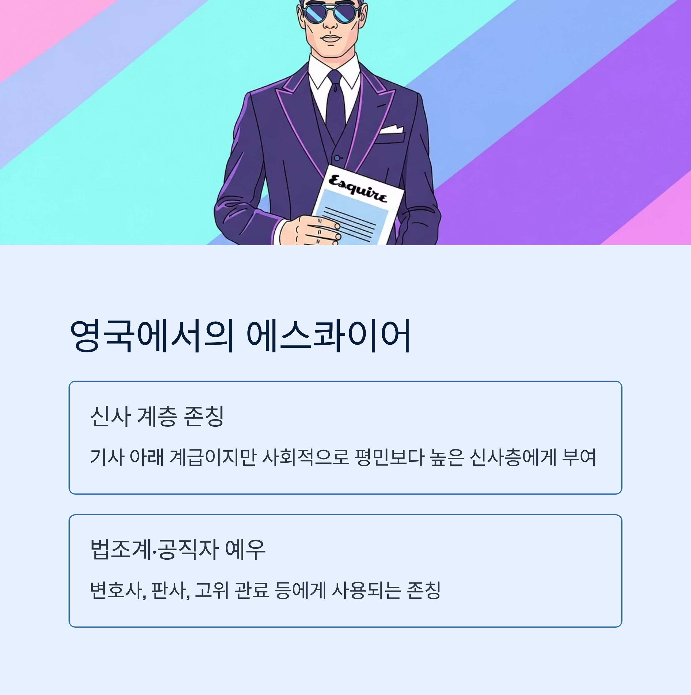 오늘날 에스콰이어 뜻은 단순히 직업적 존칭을 넘어, 전통·명예·신분적 의미를 담은 언어적 유산으로 사용됩니다.