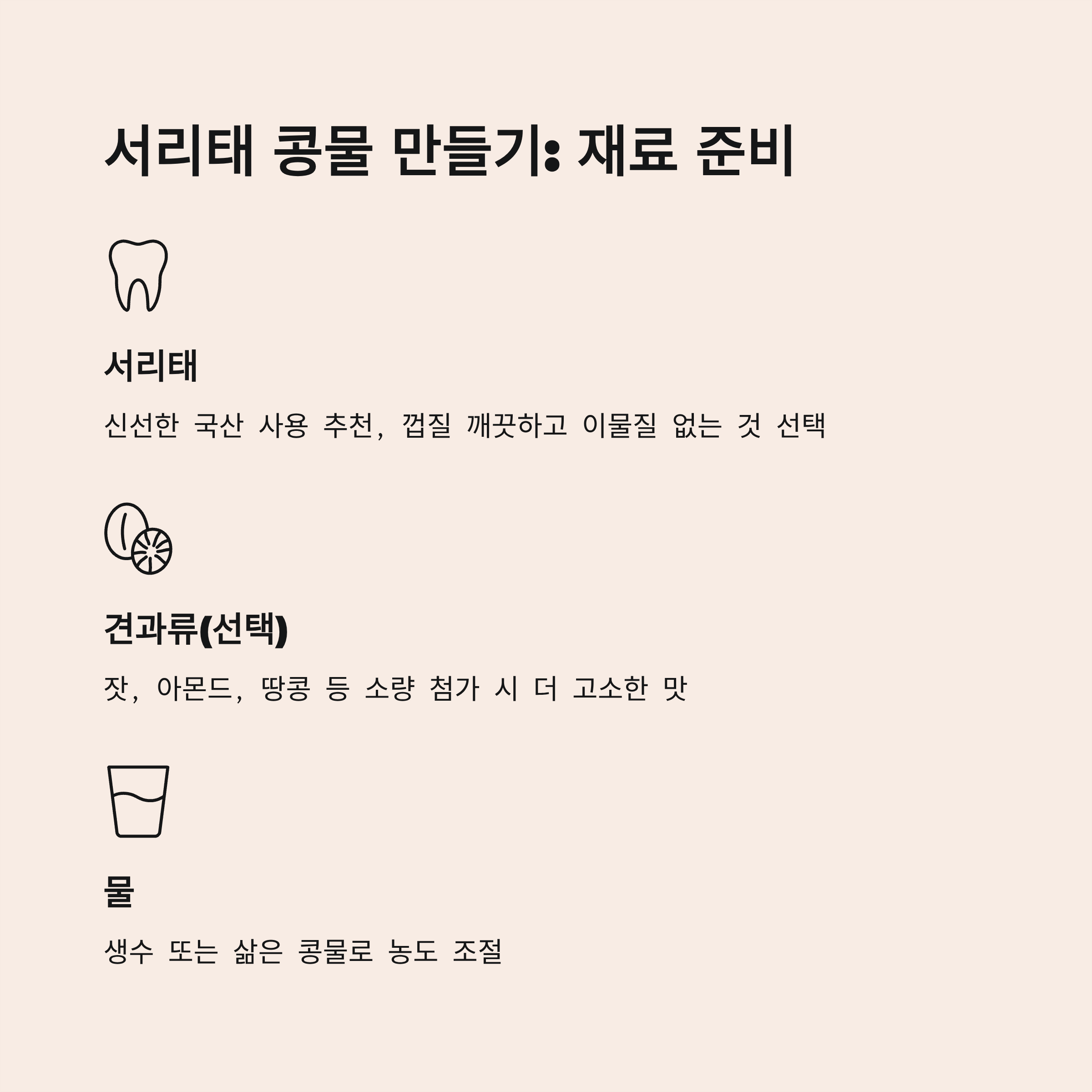| 서리태 | 신선한 국산 사용 추천, 껍질 깨끗하고 이물질 없는 것 선택 |