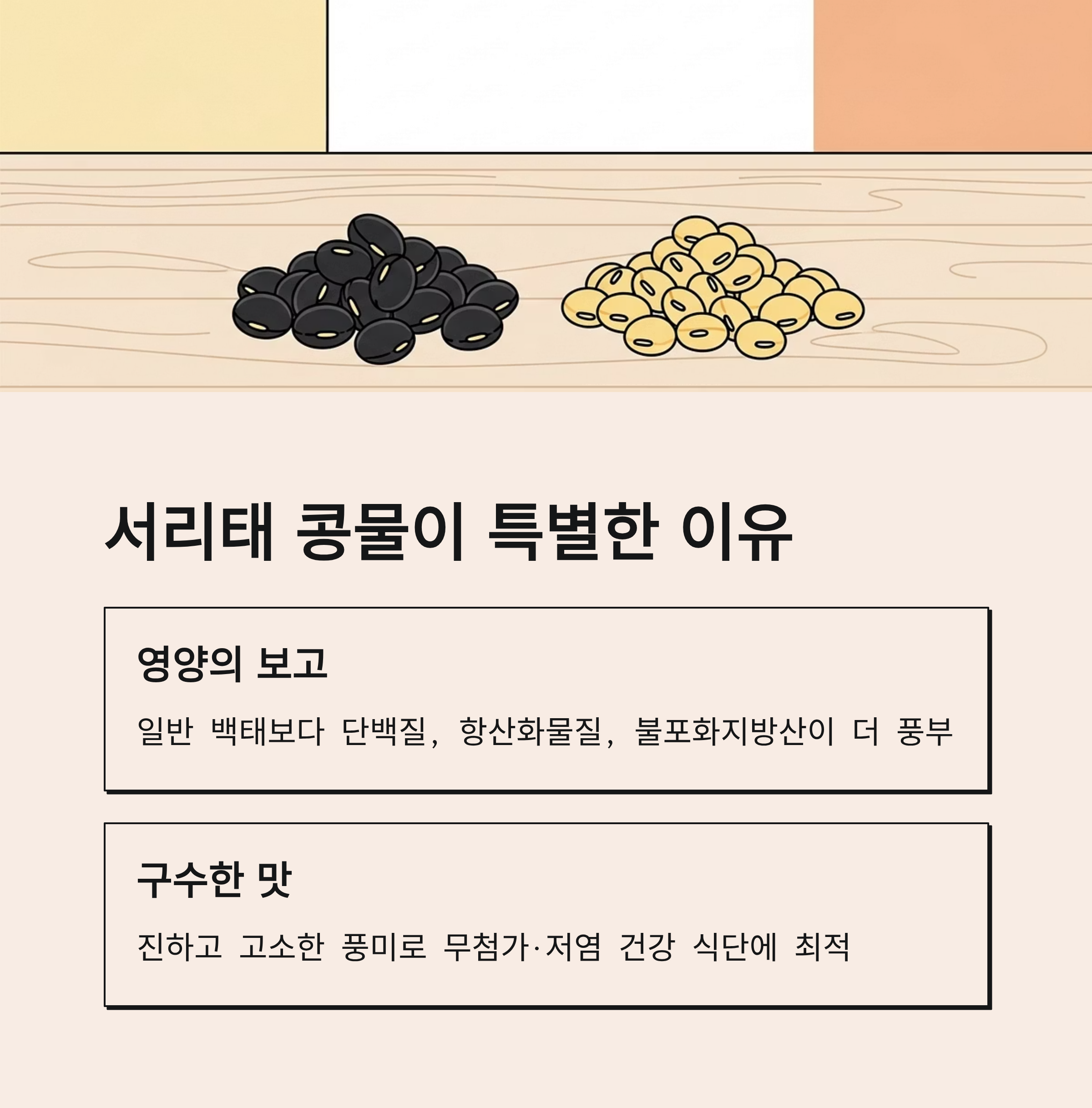 서리태는 일반 백태보다 단백질, 항산화물질, 불포화지방산이 더 풍부하여 건강에 유익합니다.