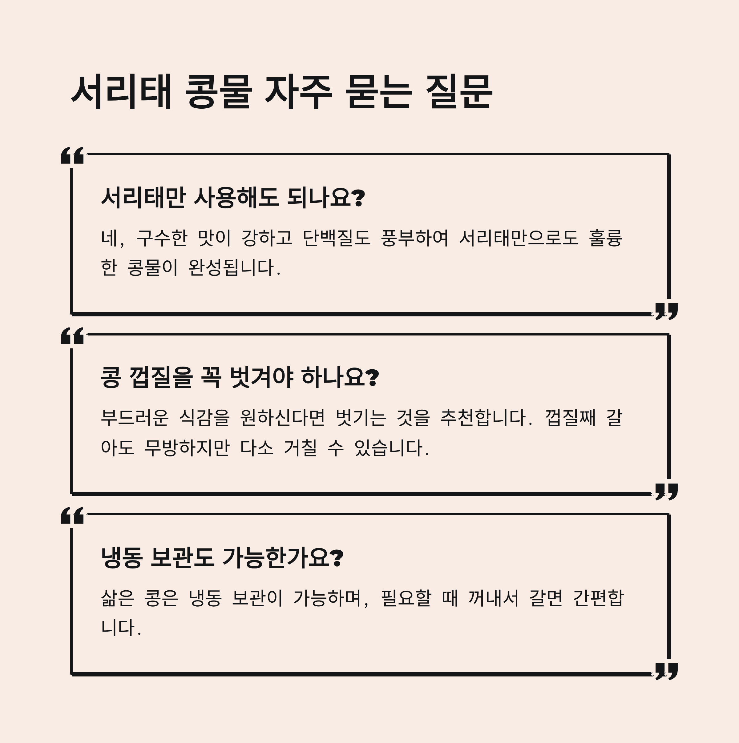 A. 네, 구수한 맛이 강하고 단백질도 풍부하여 서리태만으로도 훌륭한 콩물이 완성됩니다.
