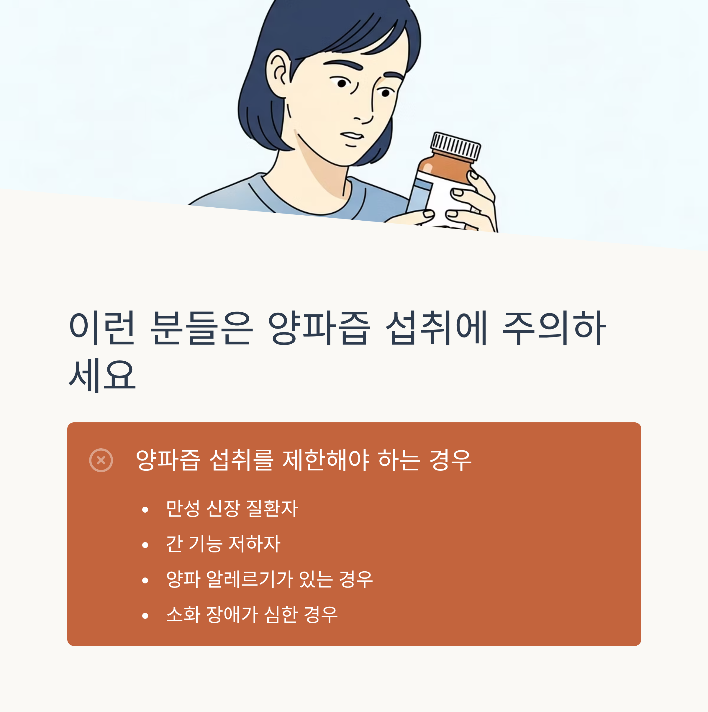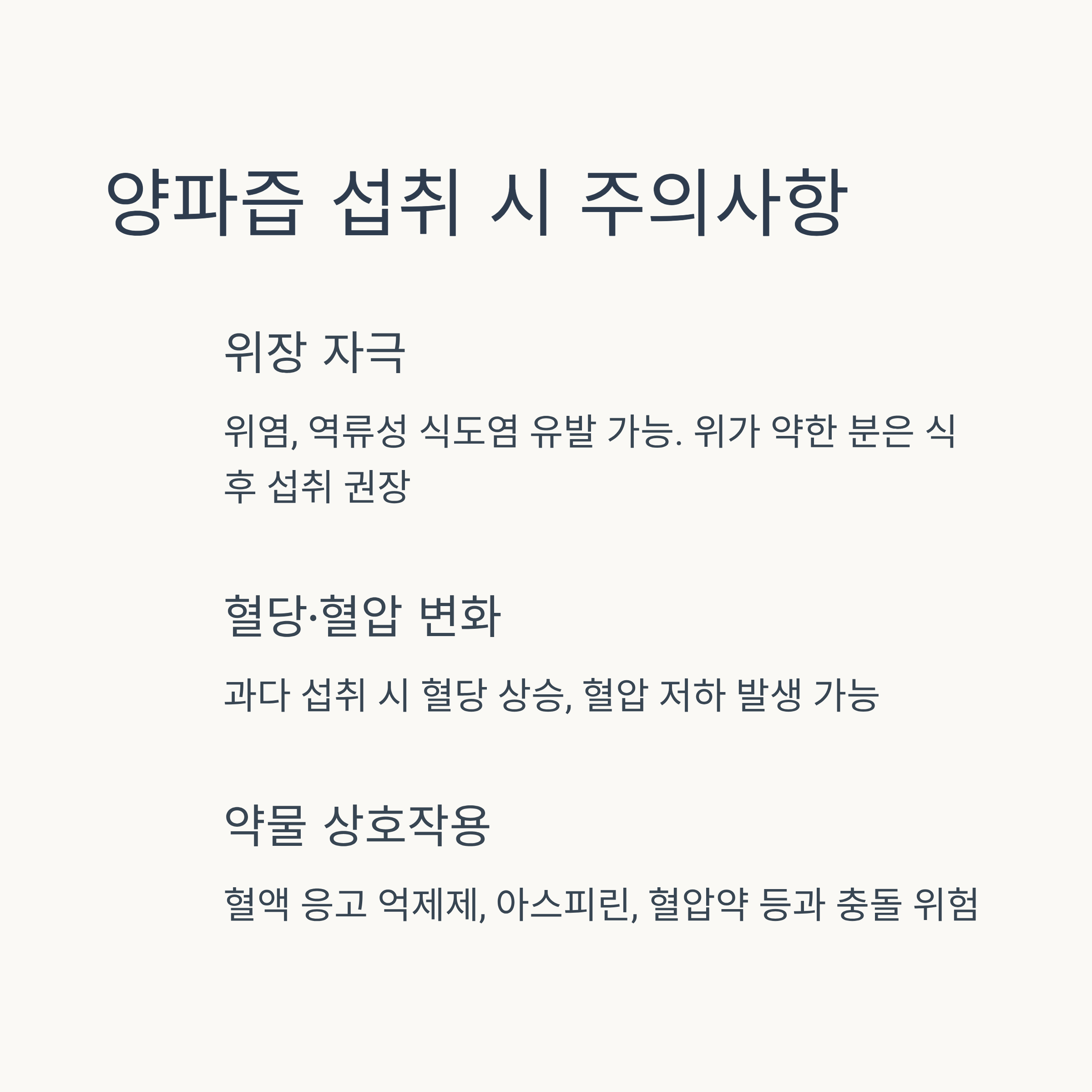 - 알레르기 반응: 양파 알레르기 있는 경우 섭취 금지.