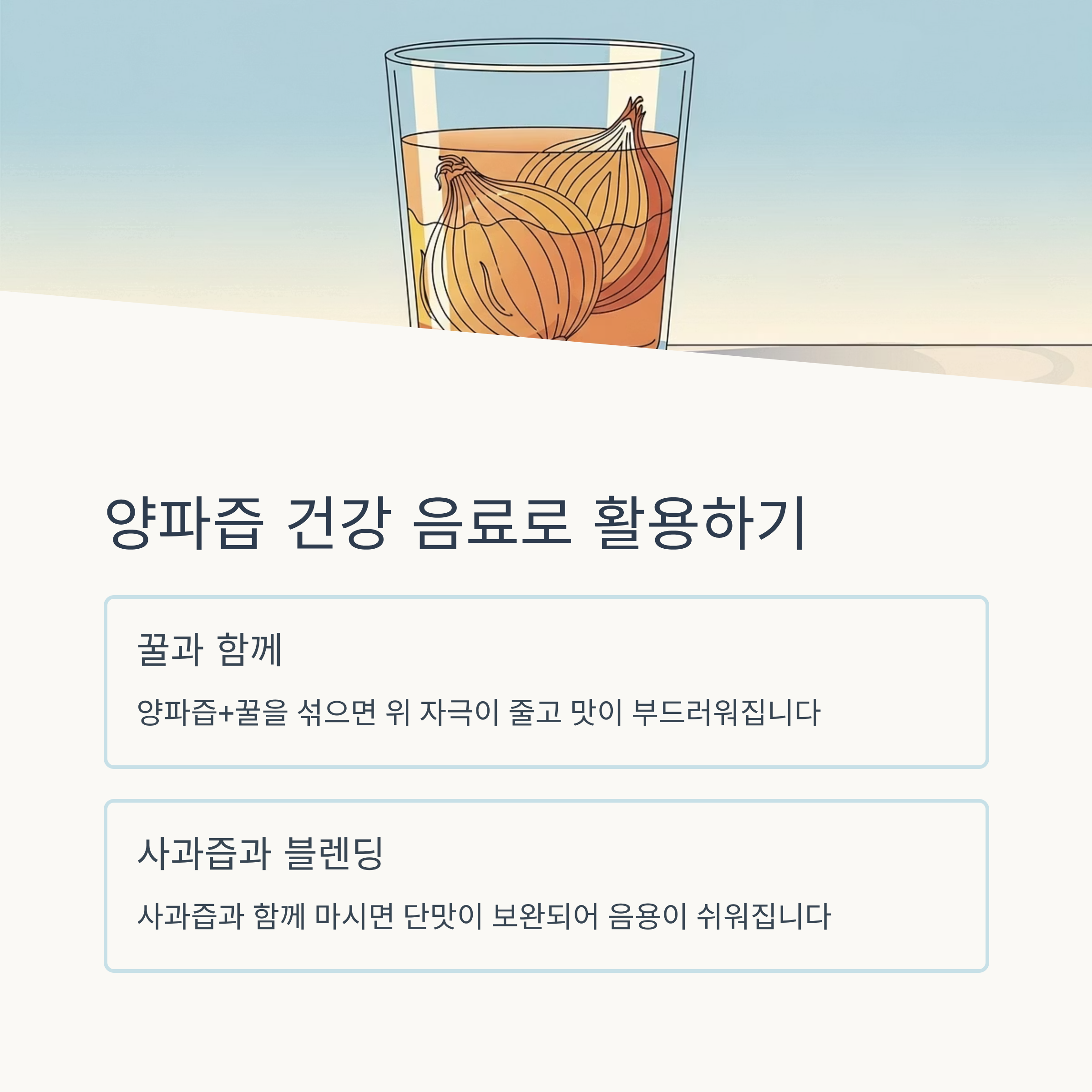 - 꿀과 함께: 양파즙+꿀을 섞으면 위 자극이 줄고 맛이 부드러워집니다.