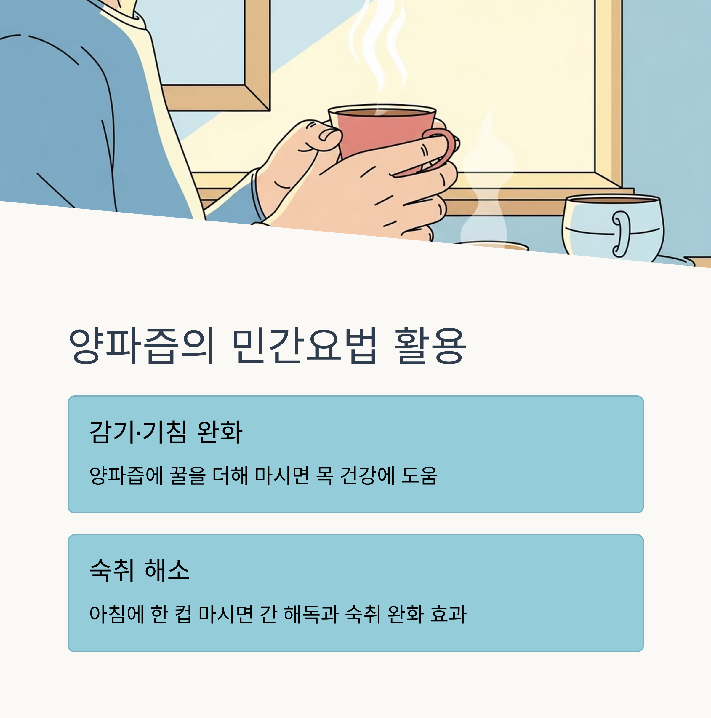 - 감기·기침 완화: 양파즙에 꿀을 더해 마시면 목 건강에 도움.