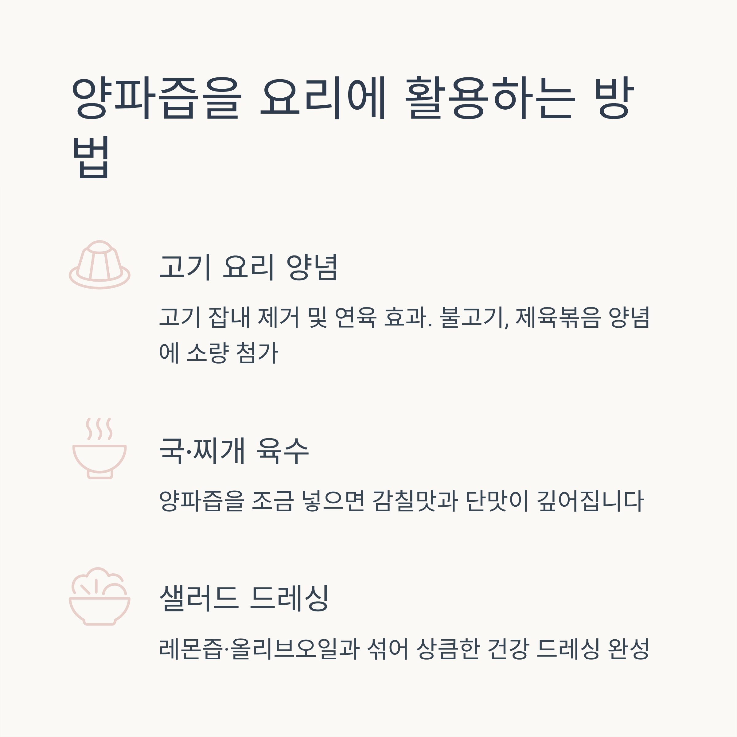 - 국·찌개 육수: 양파즙을 조금 넣으면 감칠맛과 단맛이 깊어집니다.