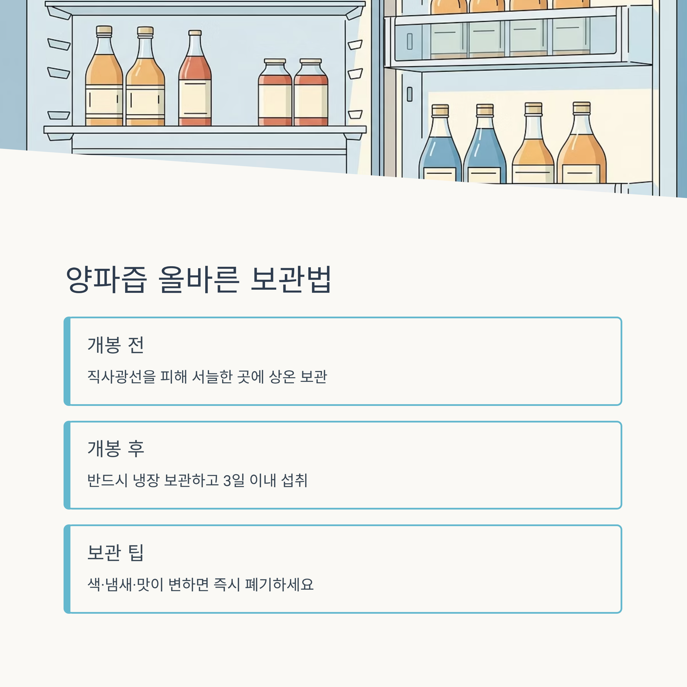 - 유통기한: 시중 제품 6개월~1년, 직접 만든 양파즙은 3일 내 섭취.