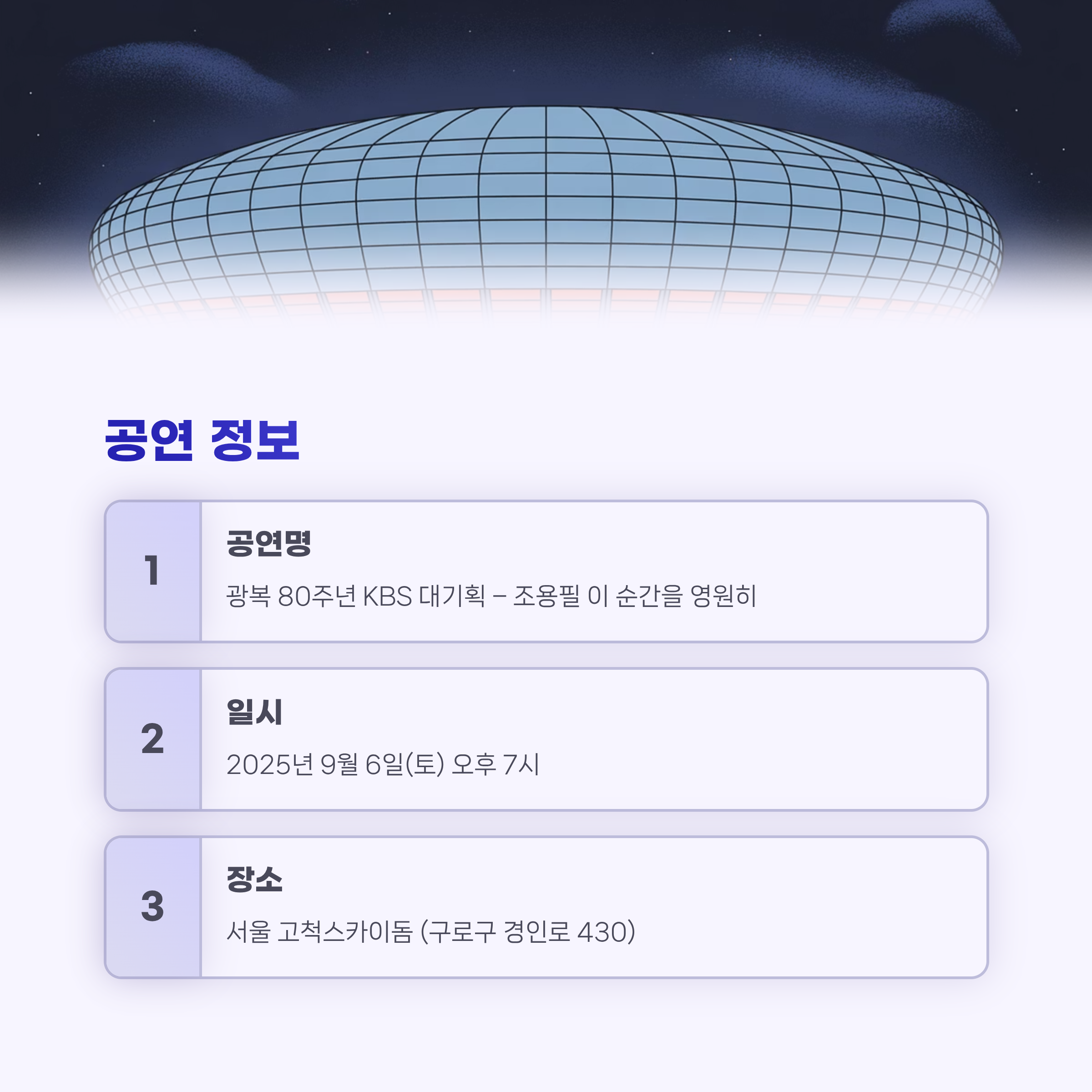 대한민국 가요계의 살아있는 전설 조용필이 광복 80주년을 기념해 특별 무료 콘서트를 개최합니다. 이번 공연은 서울 고척스카이돔에서 열리며, 전 좌석이 무료로 배정되는 만큼 예매 경쟁이 치열할 것으로 예상됩니다. 관람을 희망하시는 분들을 위해 일정, 티켓 신청 방법, 관람 유의사항을 상세히 정리했습니다.