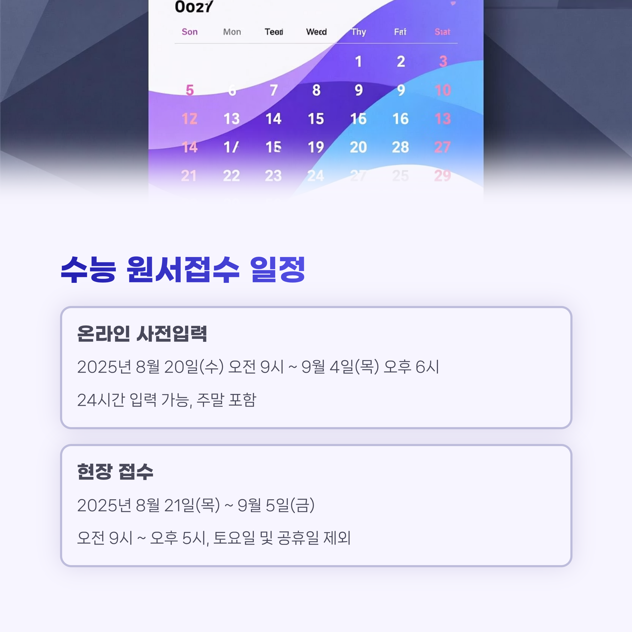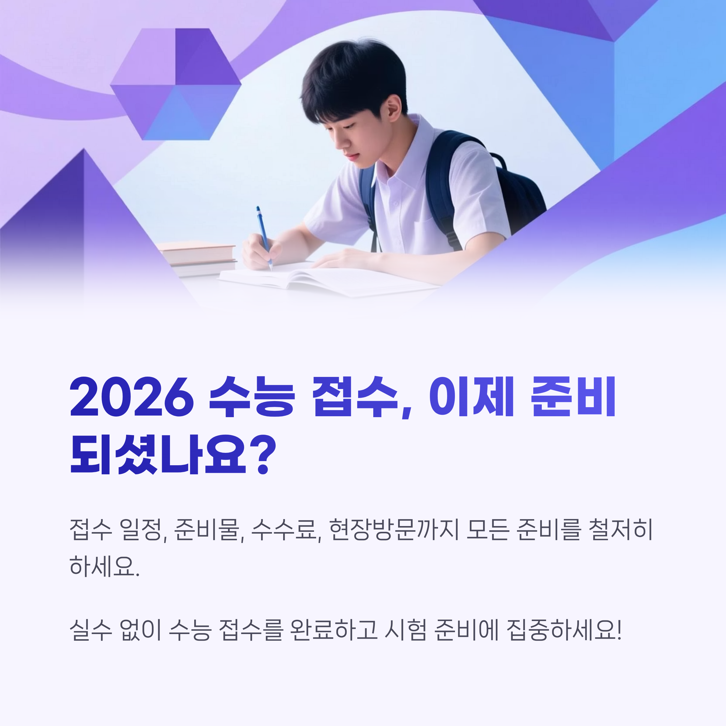접수 첫 주에 완료하면 더 여유롭고, 접수처 혼잡도 피할 수 있습니다. 지금 바로 수능 접수 준비물을 체크하고 접수 계획을 세워보세요.