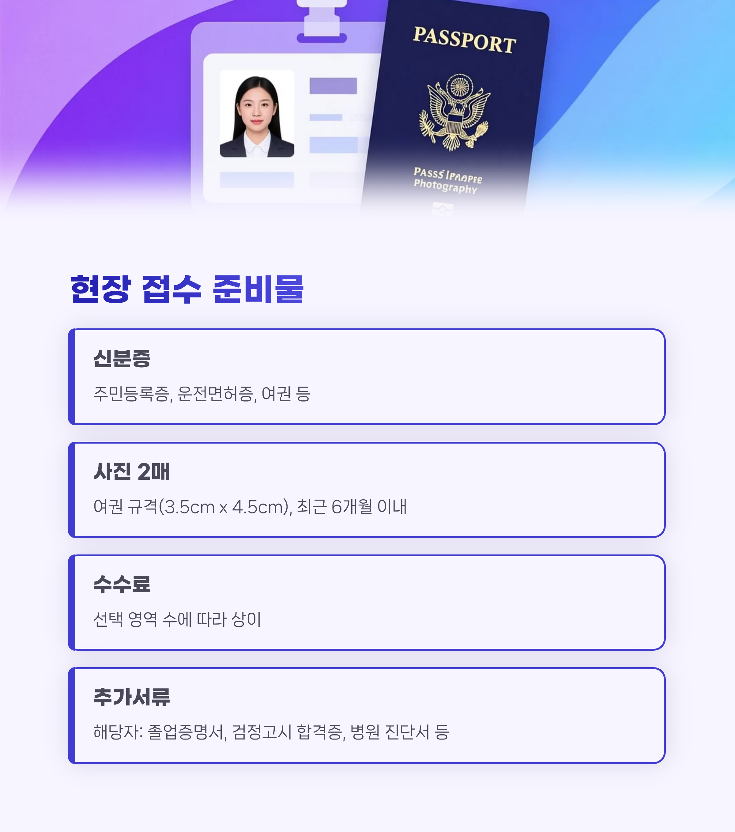 - 여권용 사진 파일 (3.5cm x 4.5cm, JPG/JPEG, 500KB 이하)