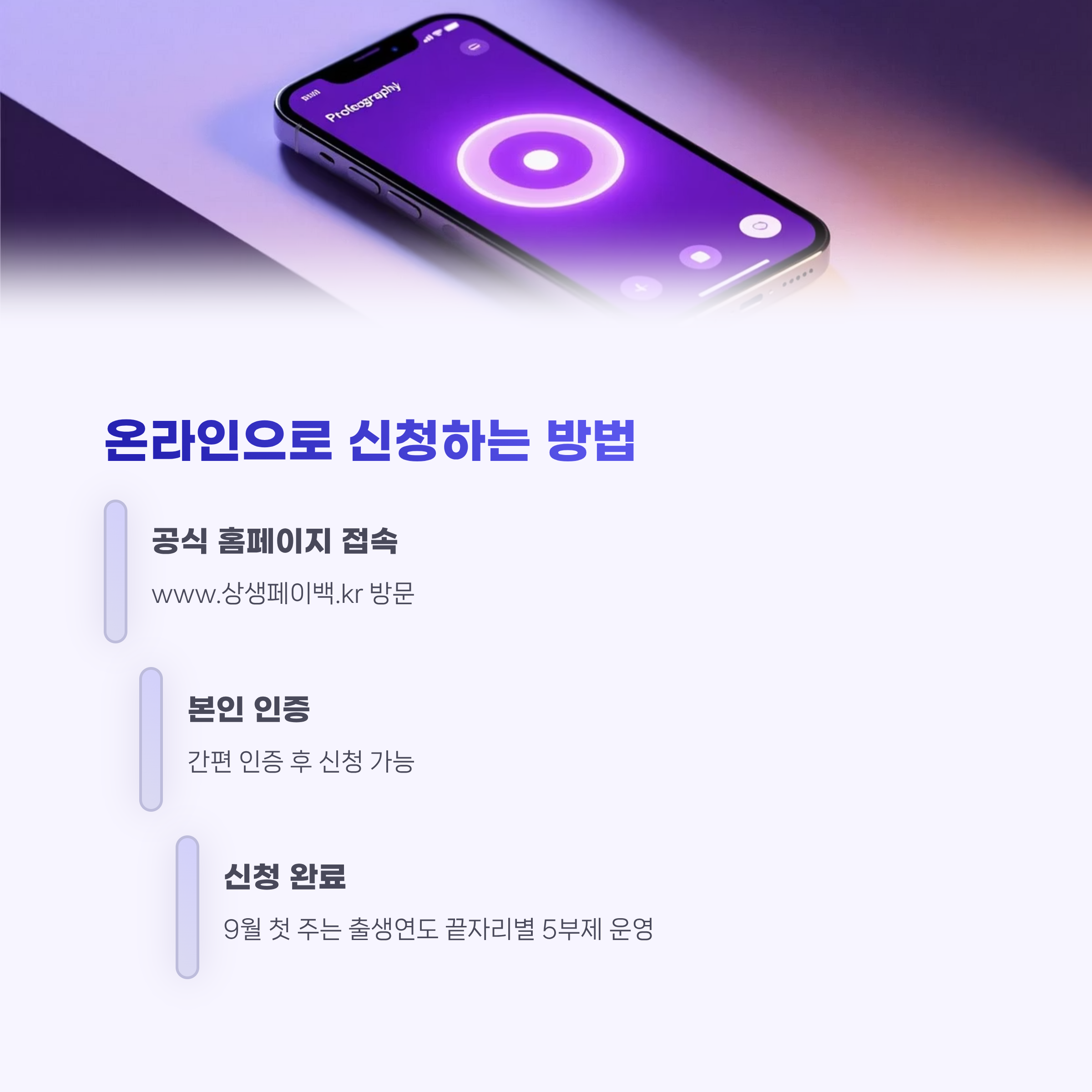 A. 온라인 신청은 "상생페이백 공식 홈페이지(www.상생페이백.kr)"에서 본인인증 후 간편하게 할 수 있어 가장 빠르고 편리합니다. 다만, 온라인이 어려운 경우에는 가까운 은행 지점이나 소상공인지원센터 등에서 현장 신청도 가능합니다.