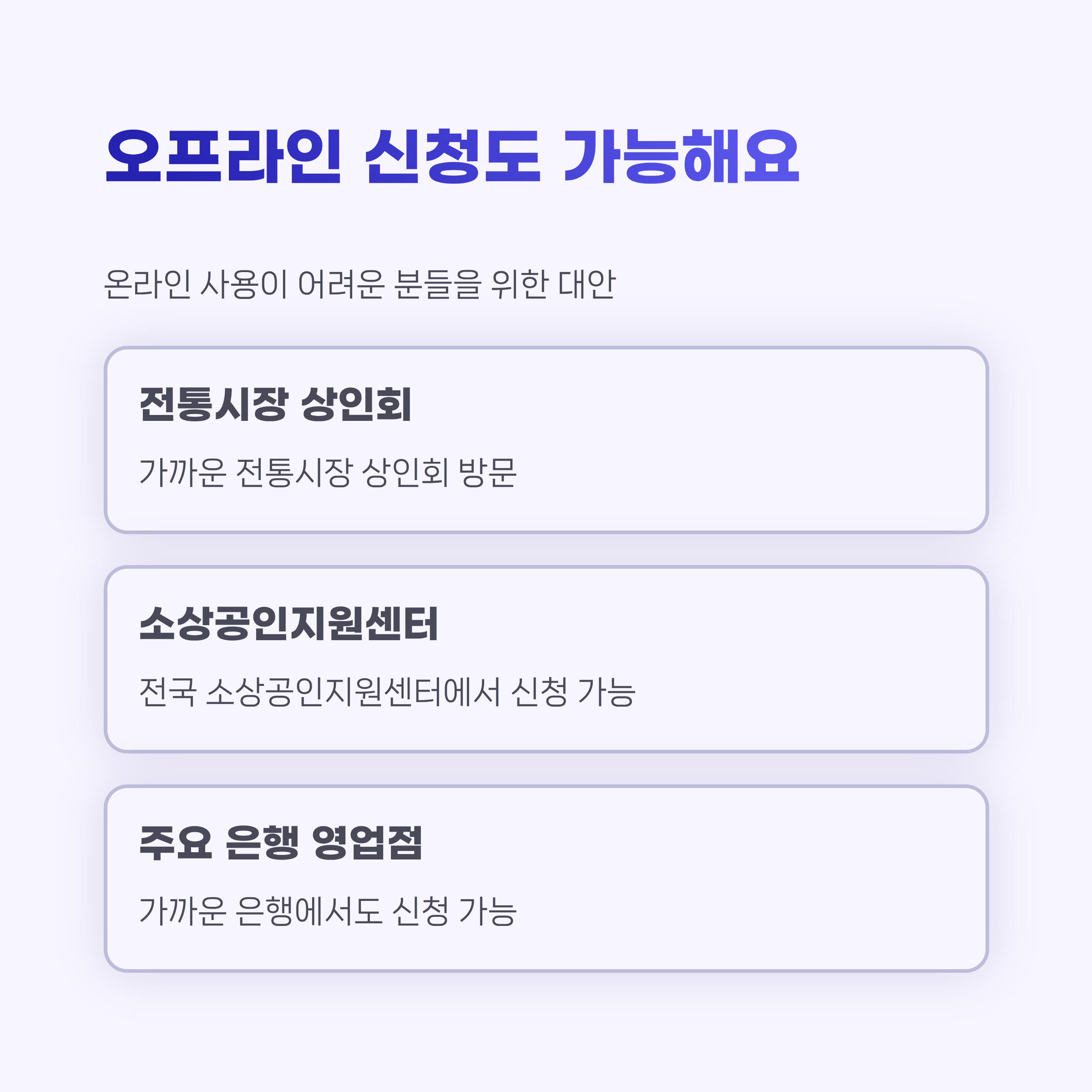 - 전국 전통시장 상인회, 소상공인지원센터, 주요 은행 영업점에서 신청 가능